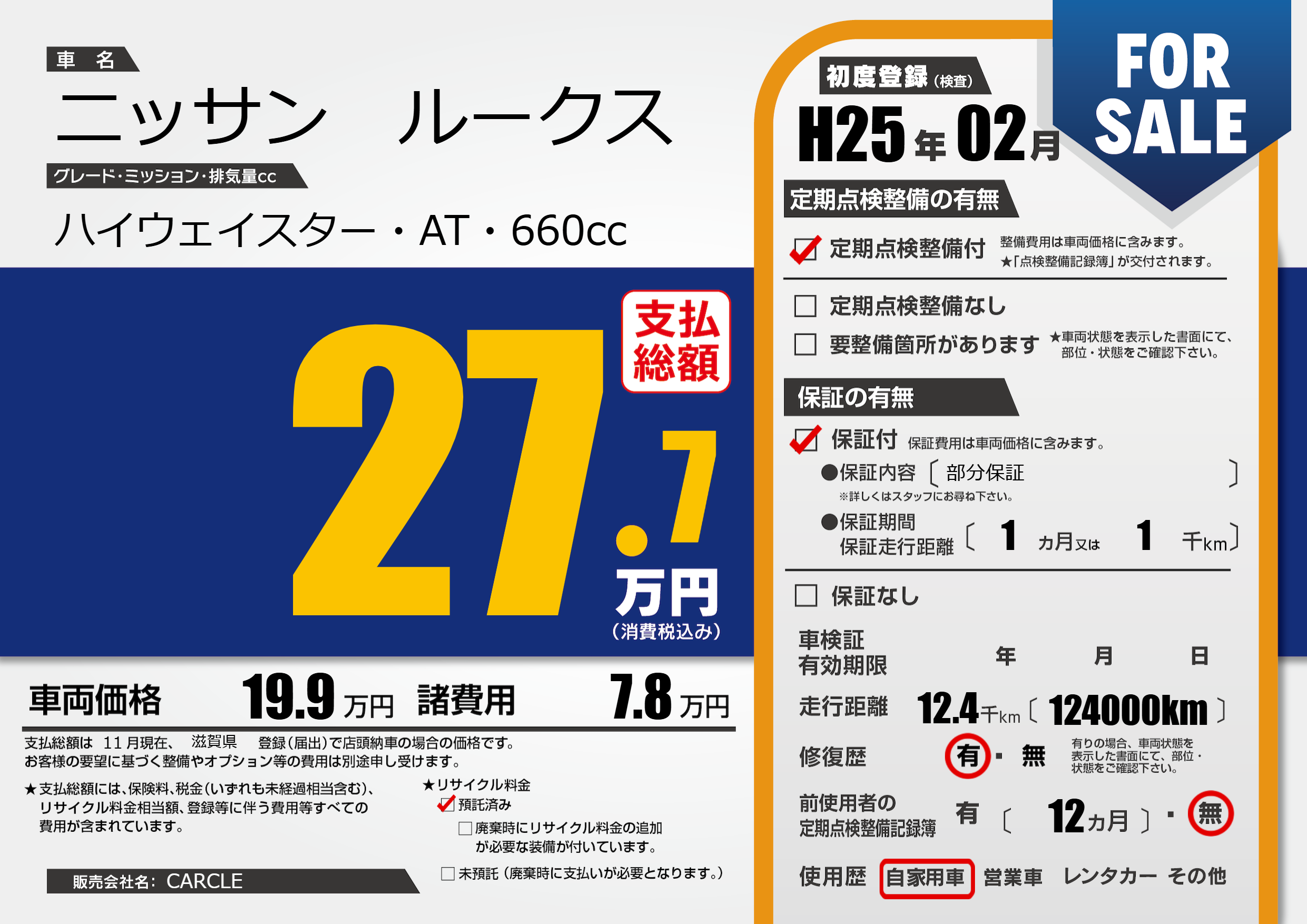 | 車名 | ニッサン ルークス | グレード ミッション 排気量 |