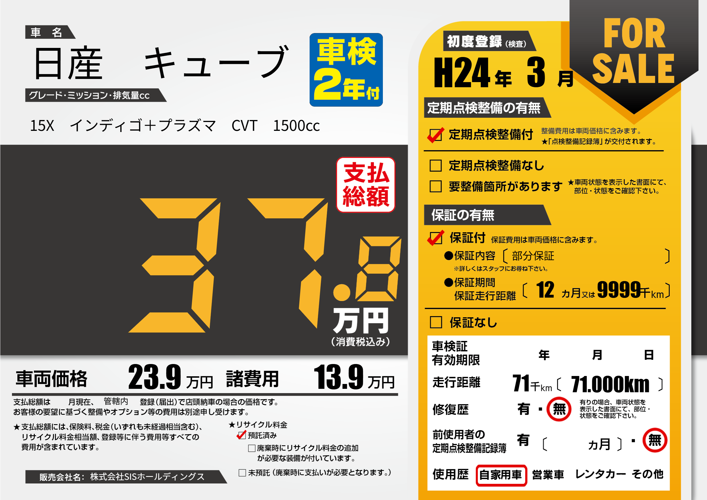 | 車名 | 日産 キューブ | グレード ミッション 排気量 |