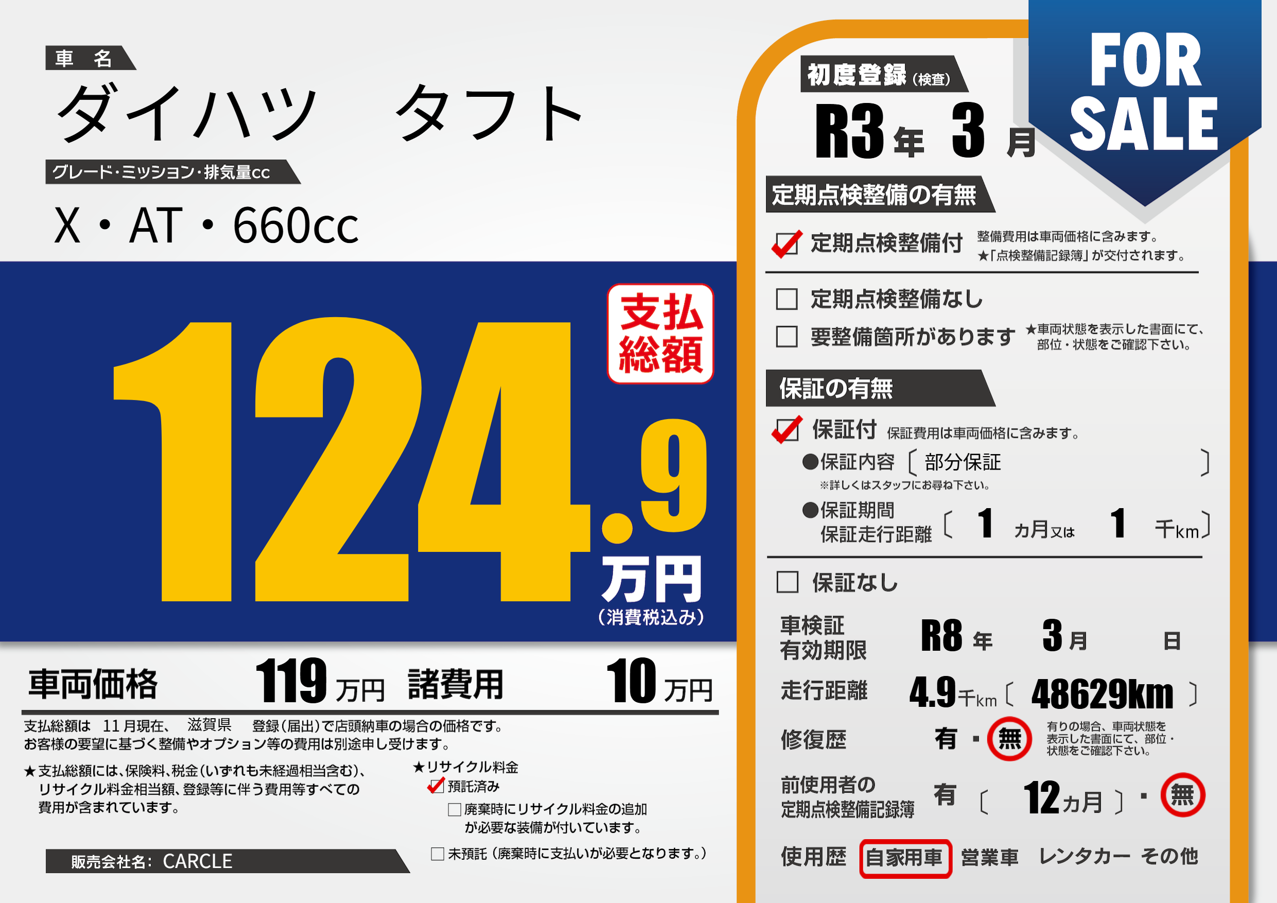 | 車名 | ダイハツ タフト | グレード ミッション 排気量 |