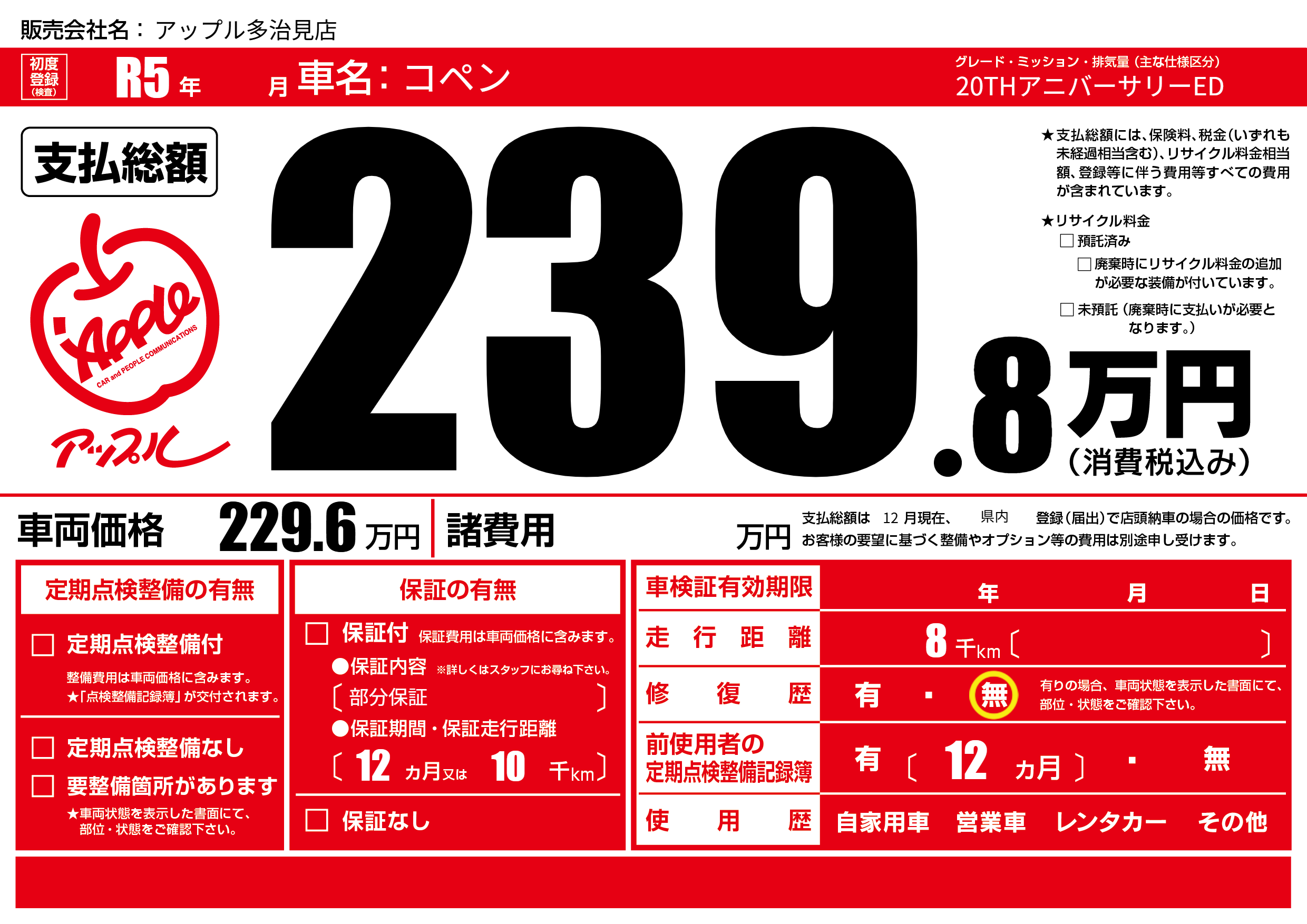 | 走行キロ | 0.8万km | 初年度登録 | R5年---月 |