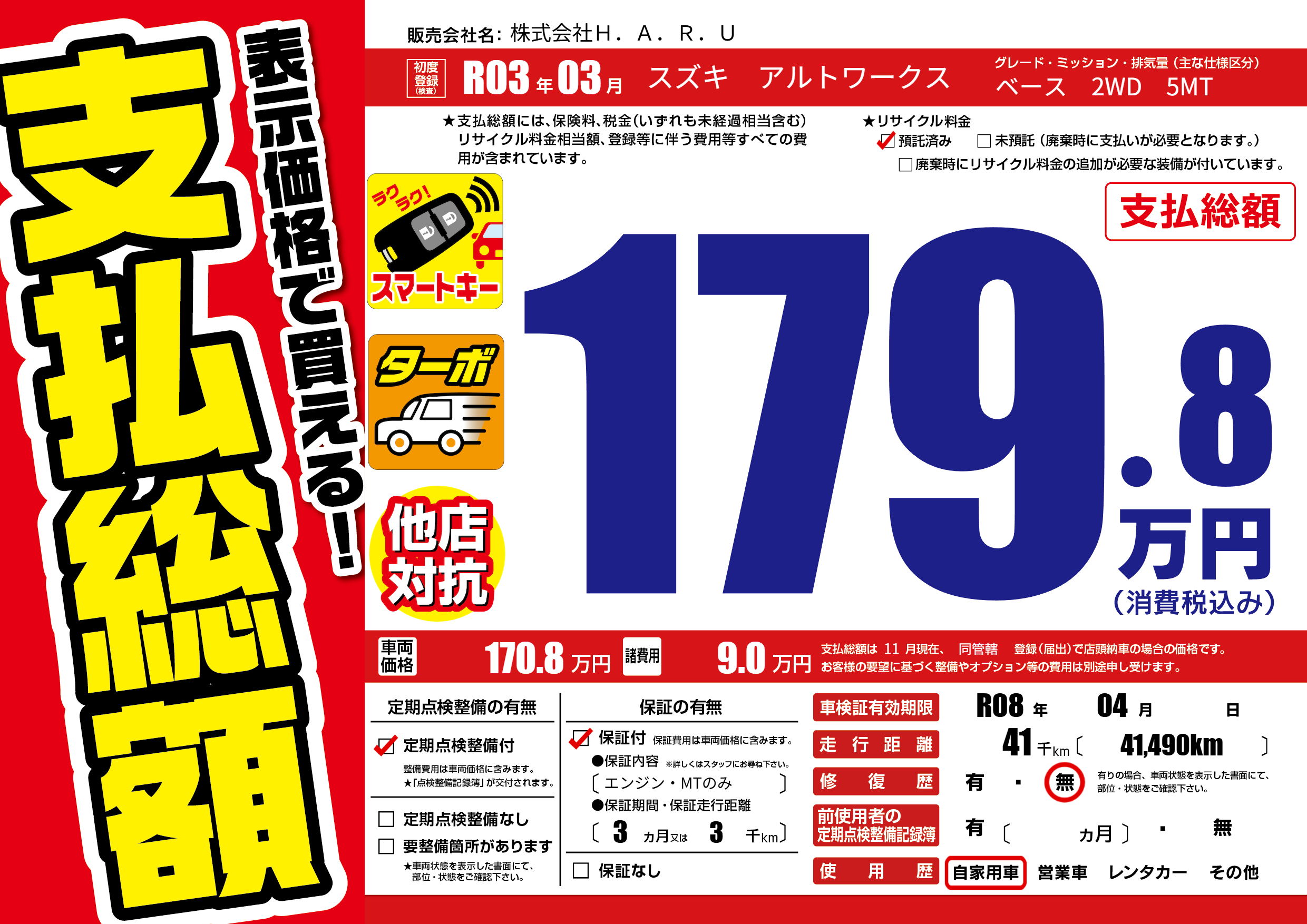 | 車名 | スズキ アルトワークス | グレード ミッション 排気量 |