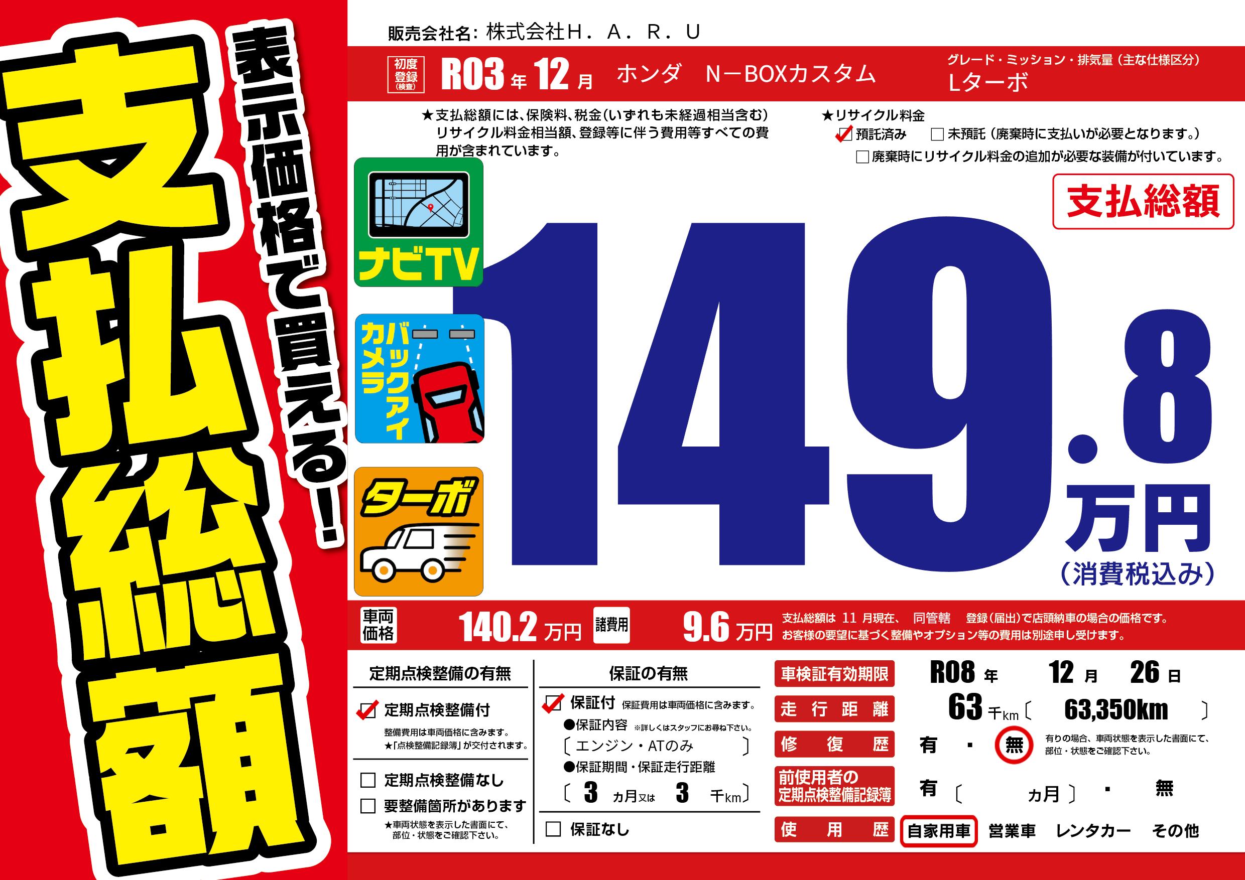 | 走行キロ | 6.3万km | 初年度登録 | R03年12月 |