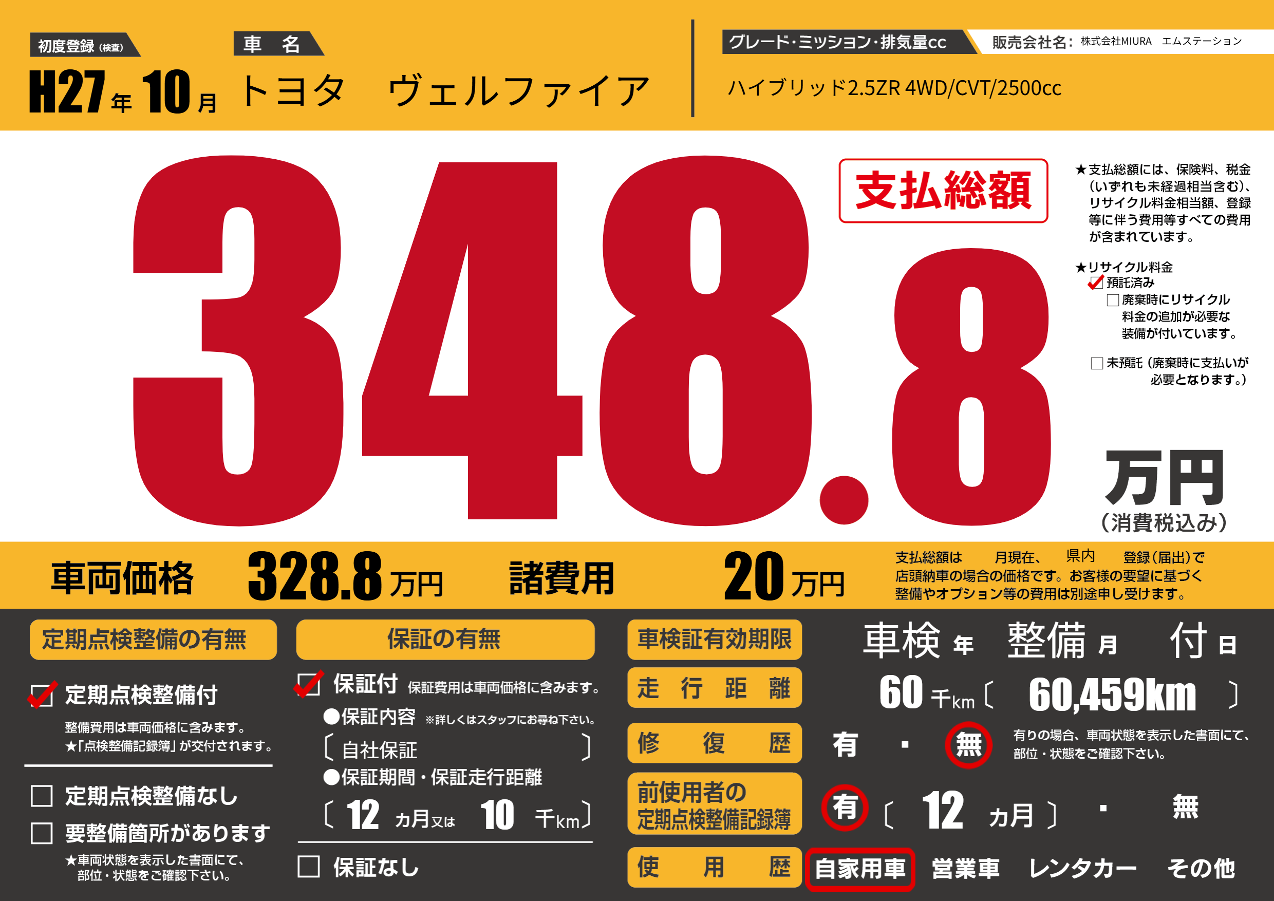 | 車名 | トヨタ ヴェルファイア | グレード ミッション 排気量 |
