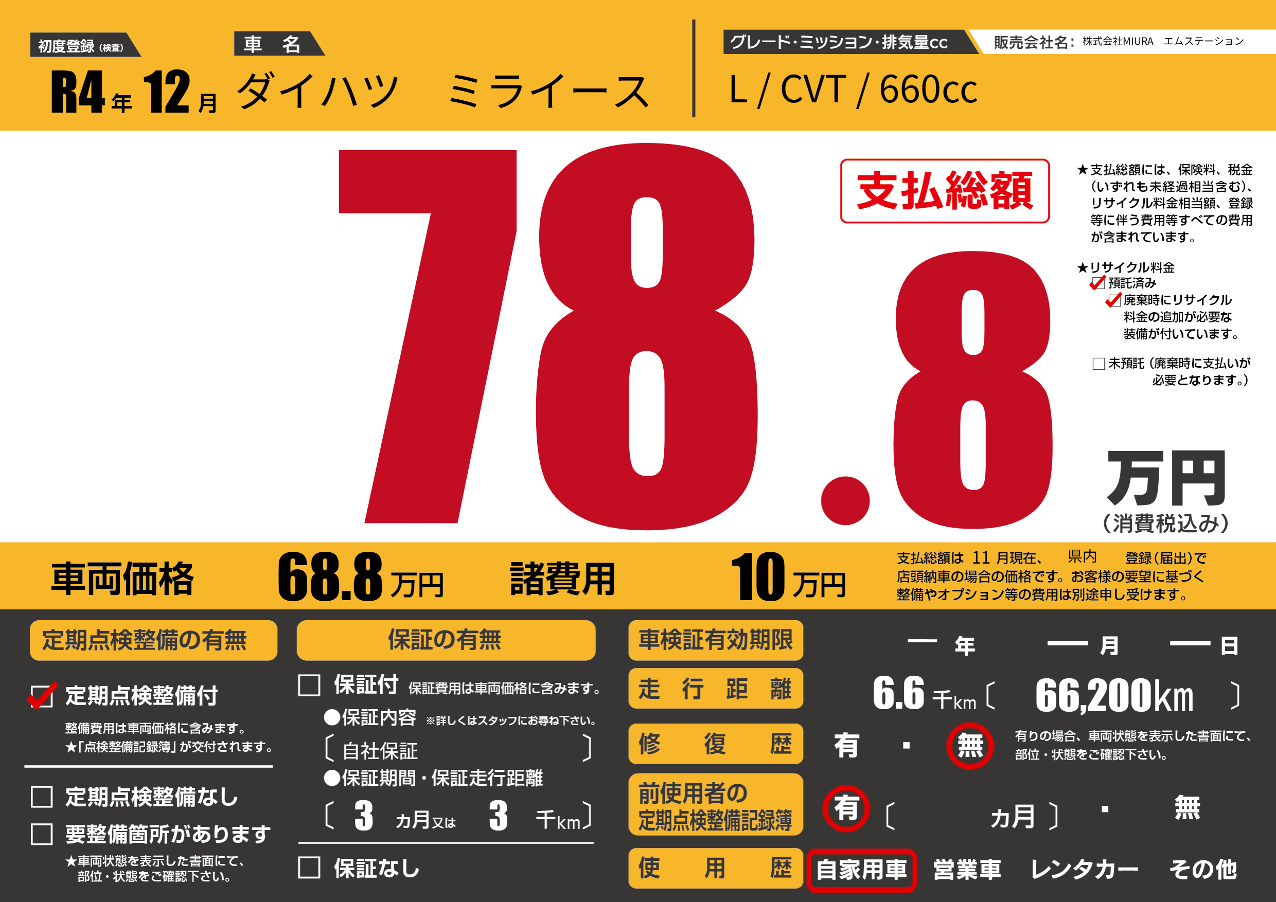 | 走行キロ | 0.6万km | 初年度登録 | R4年12月 |