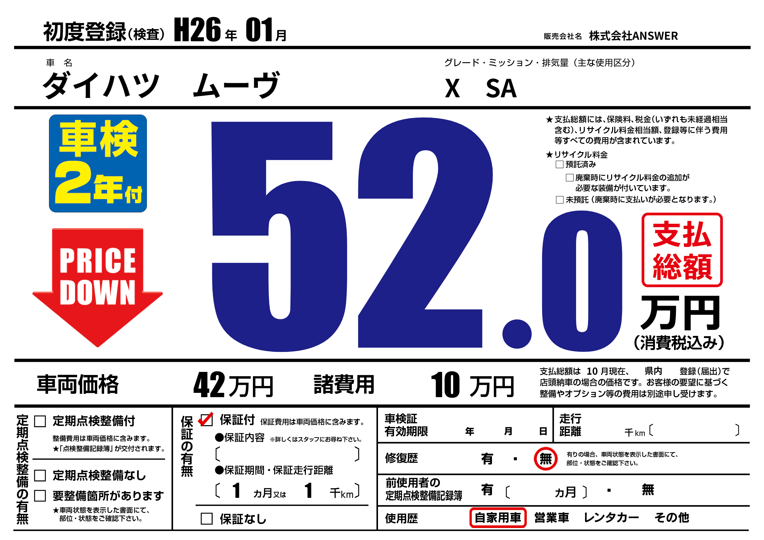 | 走行キロ | - | 初年度登録 | H26年01月 |