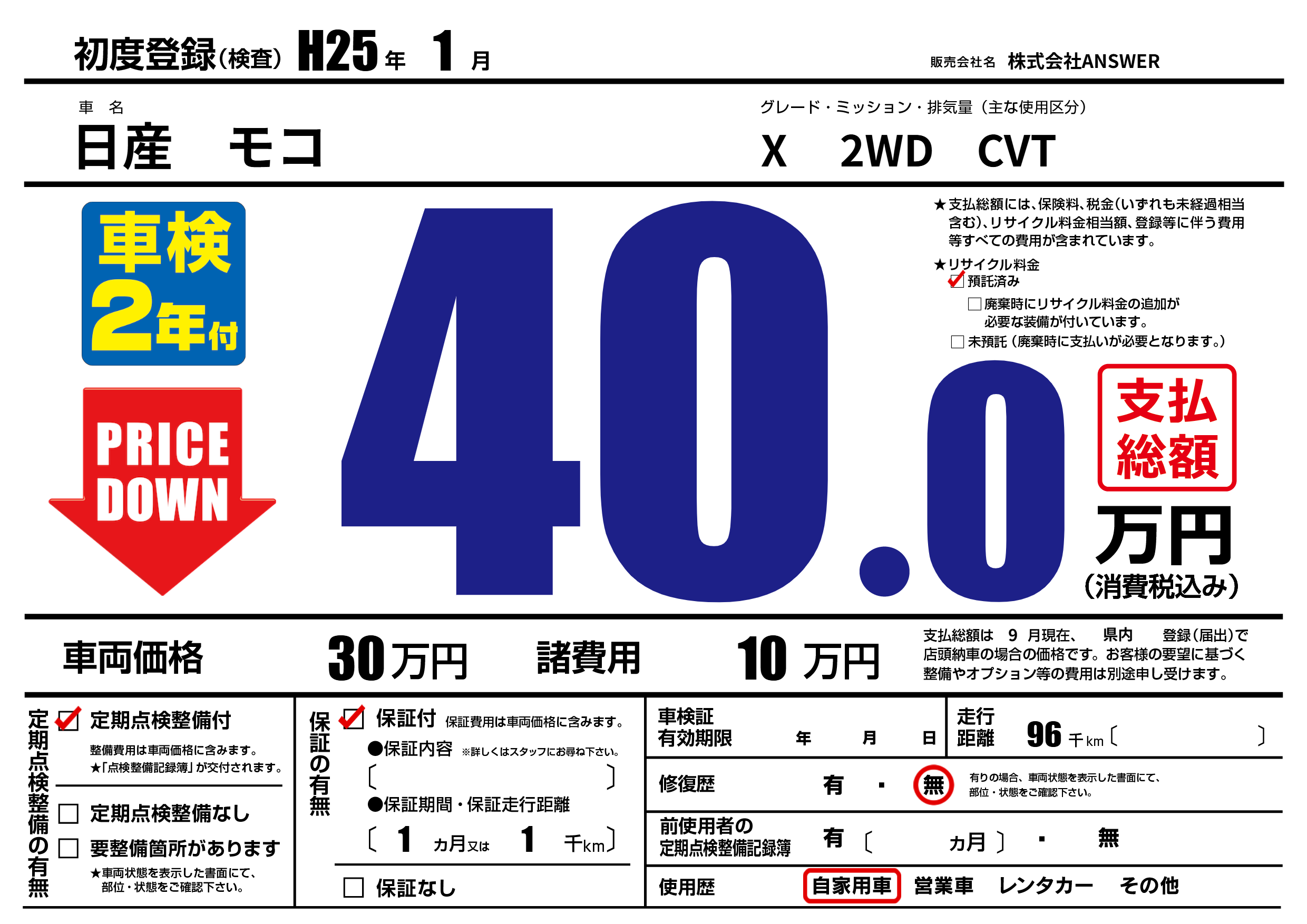 | 車名 | 日産 モコ | グレード ミッション 排気量 |