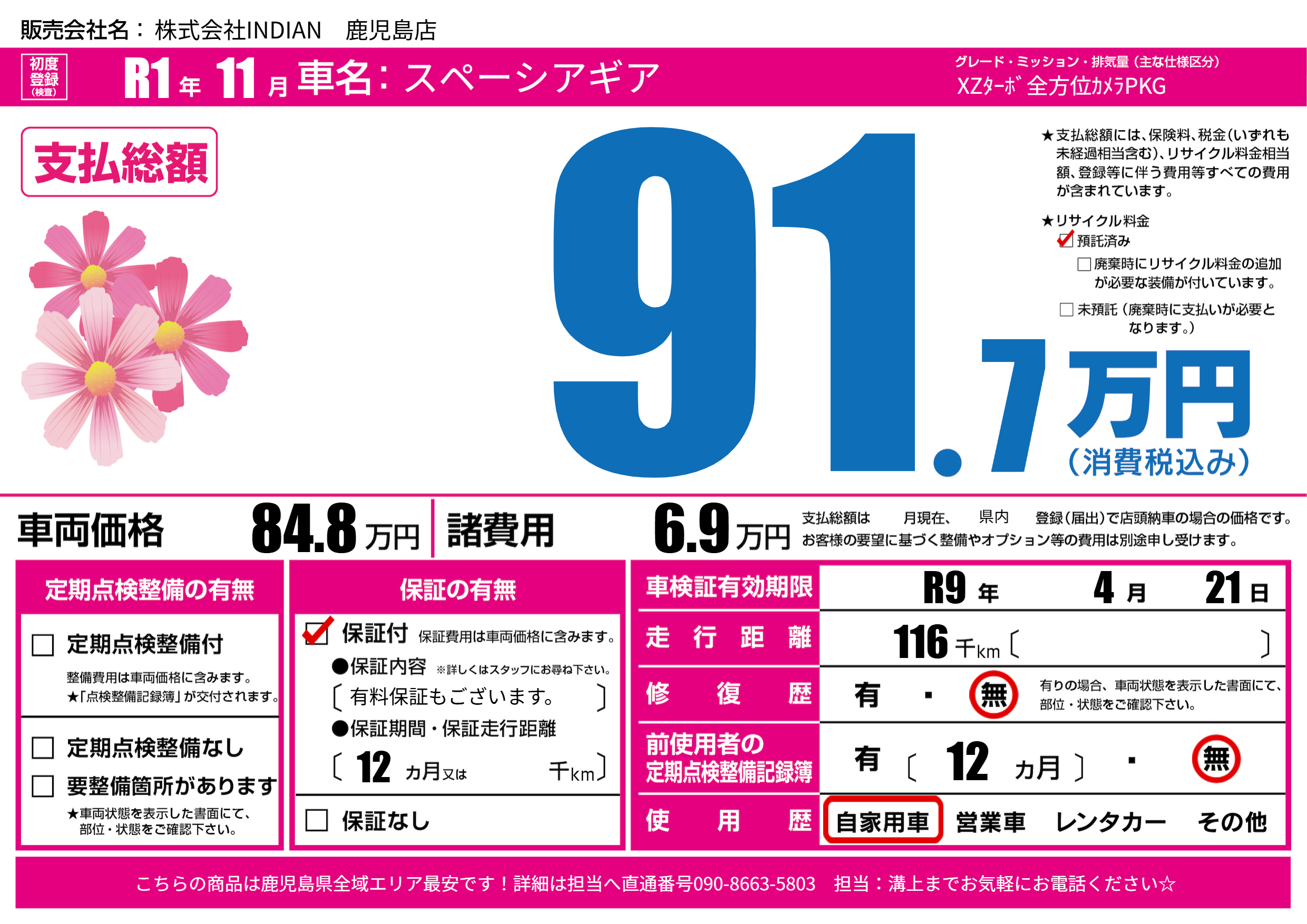 | 走行キロ | 11.6万km | 初年度登録 | R1年11月 |