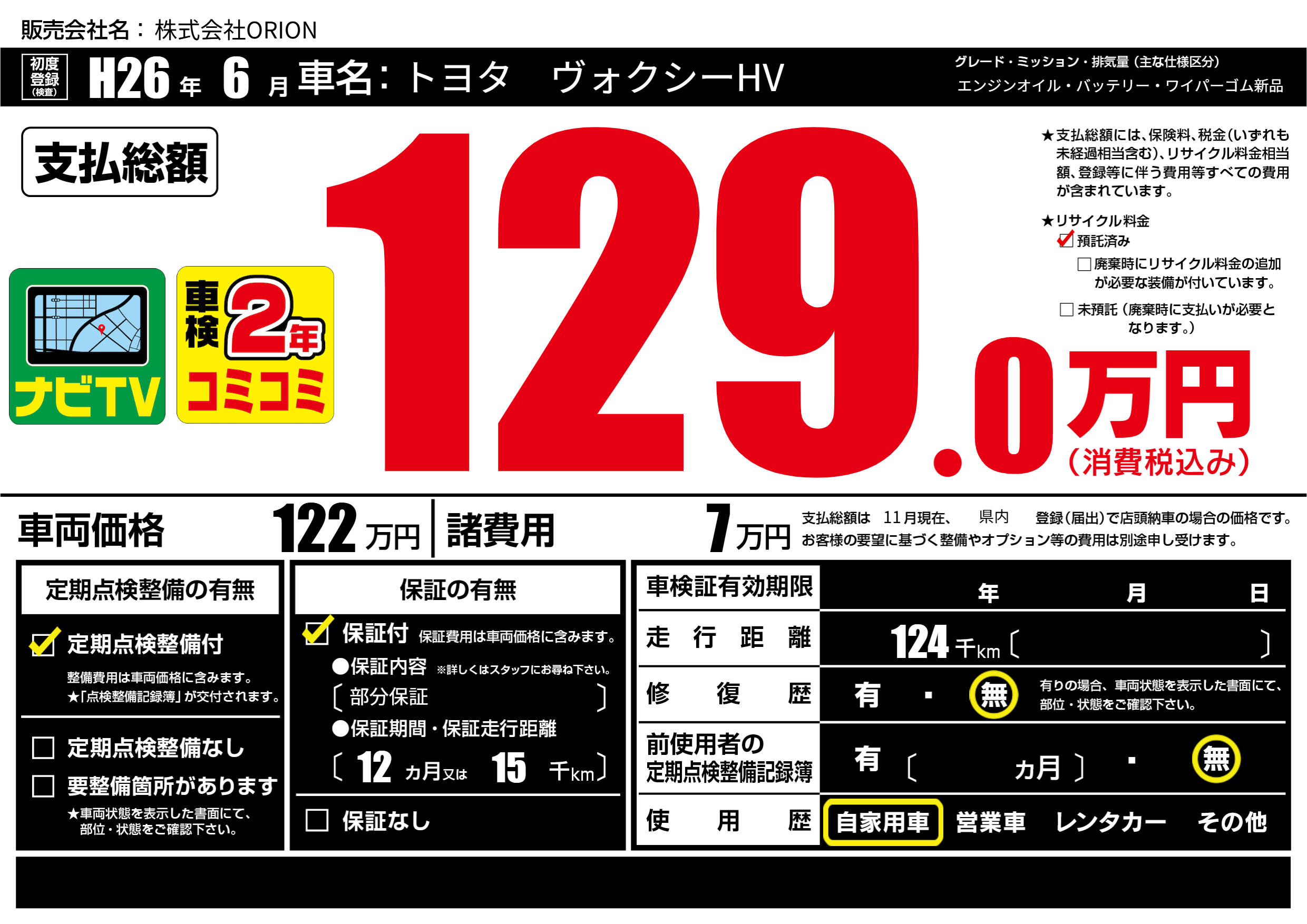 | 走行キロ | 12.4万km | 初年度登録 | H26年6月 |