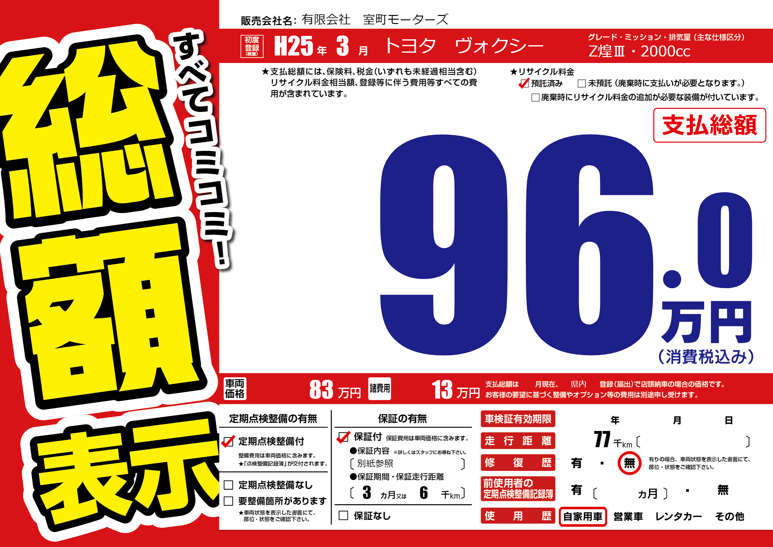 | 走行キロ | 7.7万km | 初年度登録 | H25年3月 |