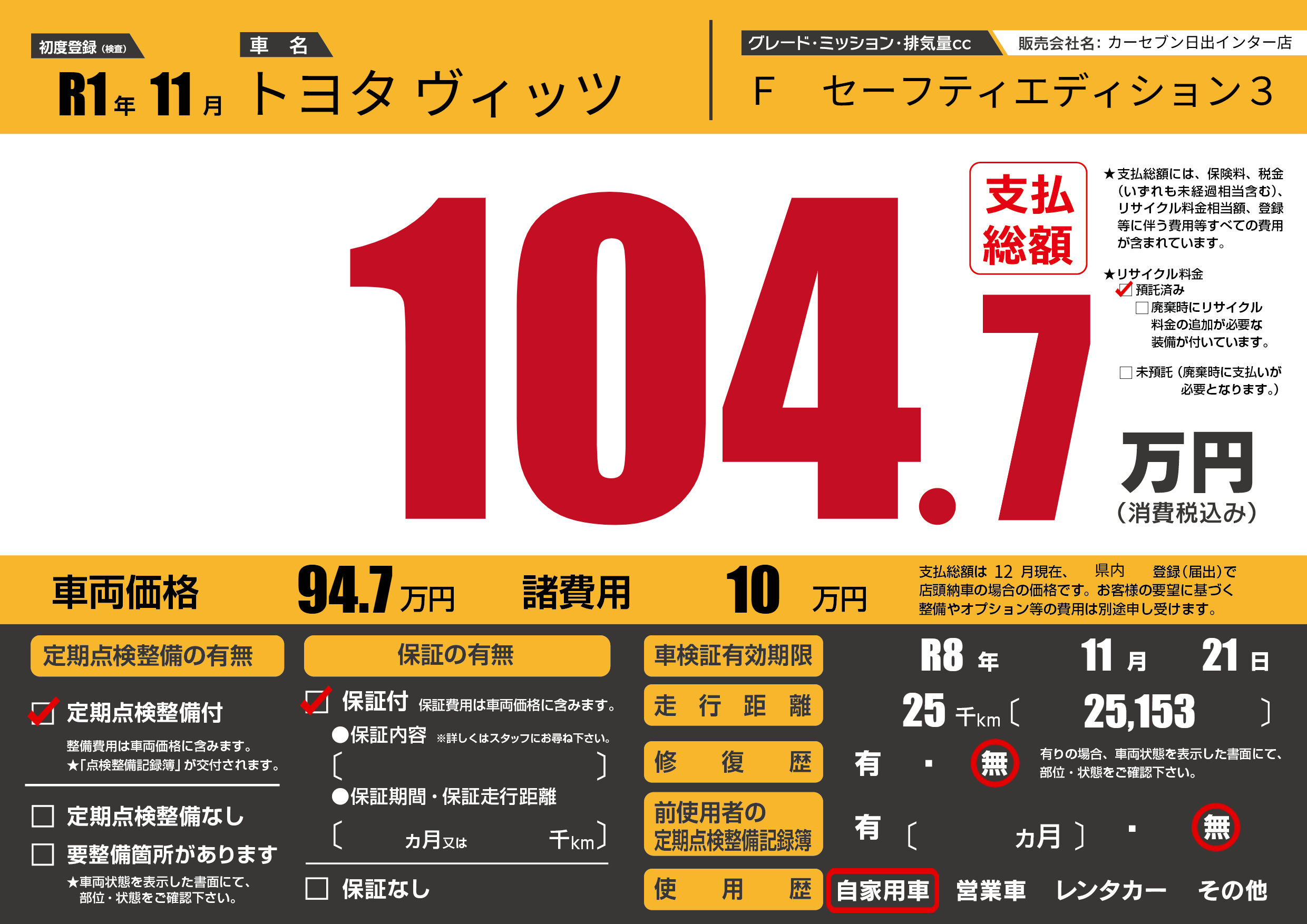 | 車名 | トヨタ ヴィッツ | グレード ミッション 排気量 |