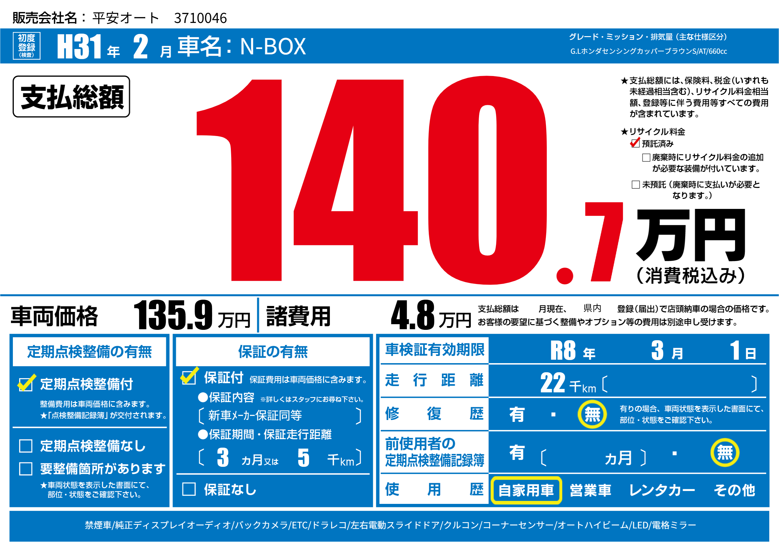 | 車名 | N-BOX | グレード ミッション 排気量 |