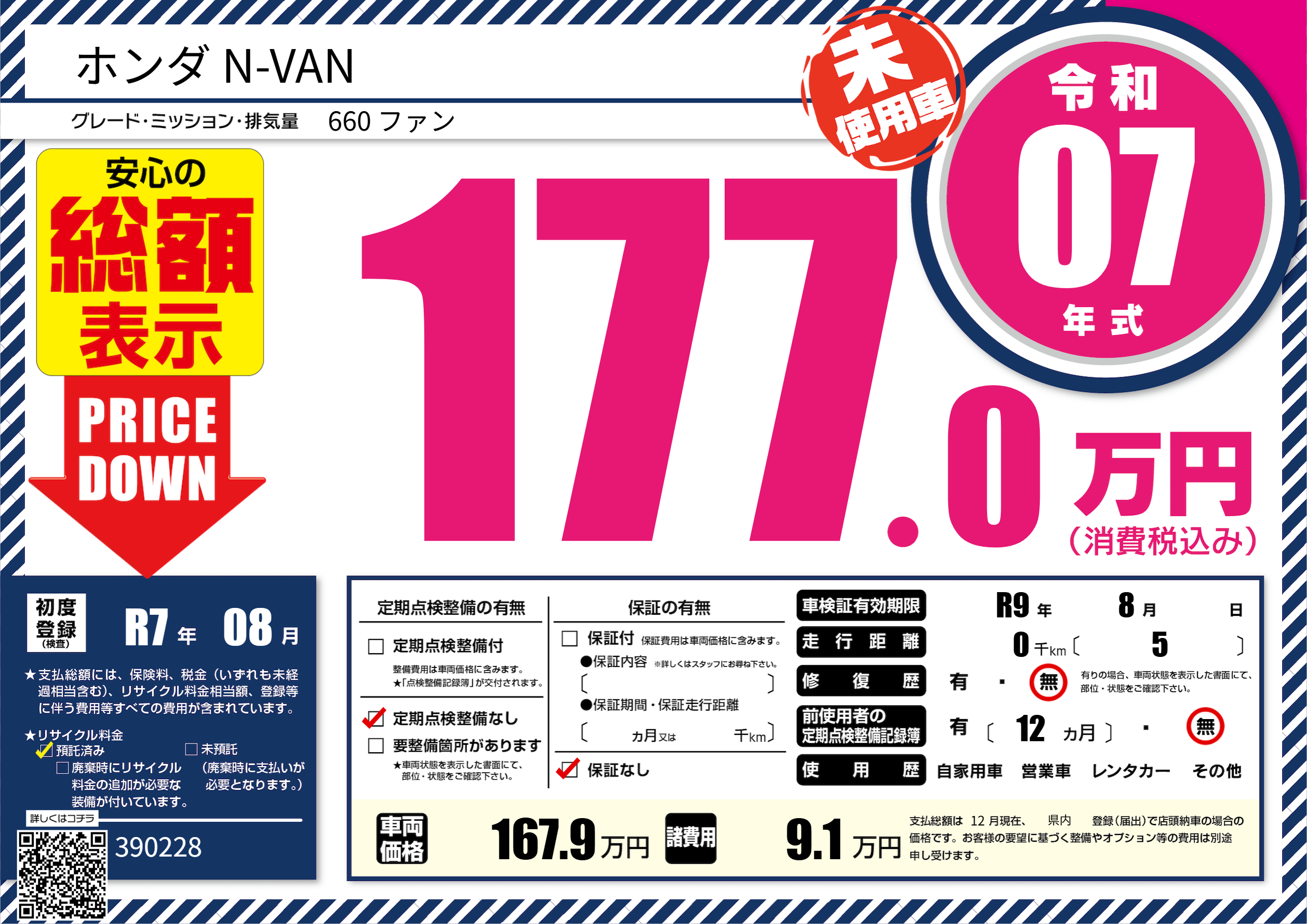 | 車名 | ホンダ N-VAN | グレード ミッション 排気量 |