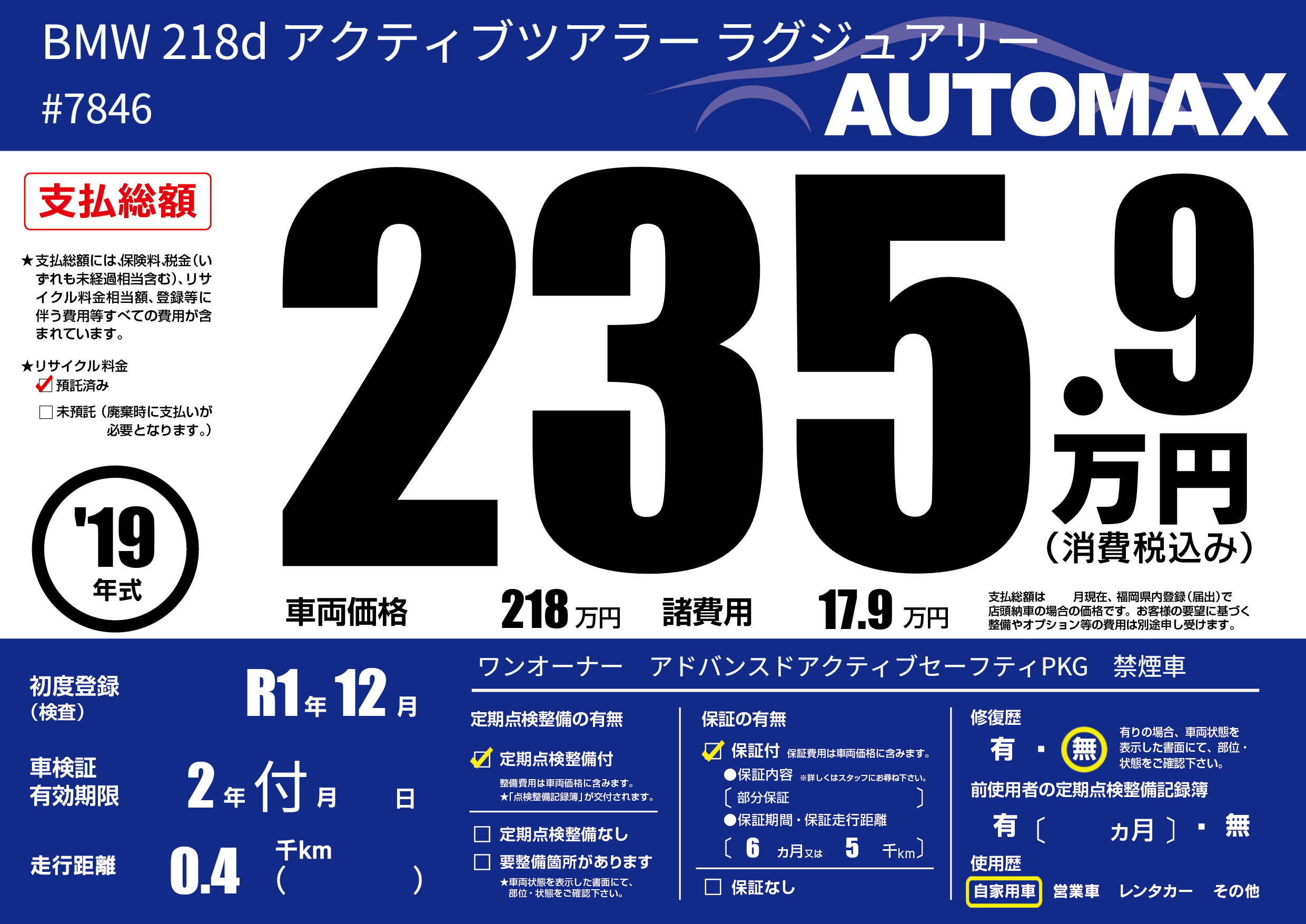 | 車名 | BMW 218d アクティブツアラー ラグジュアリー | グレード ミッション 排気量 |