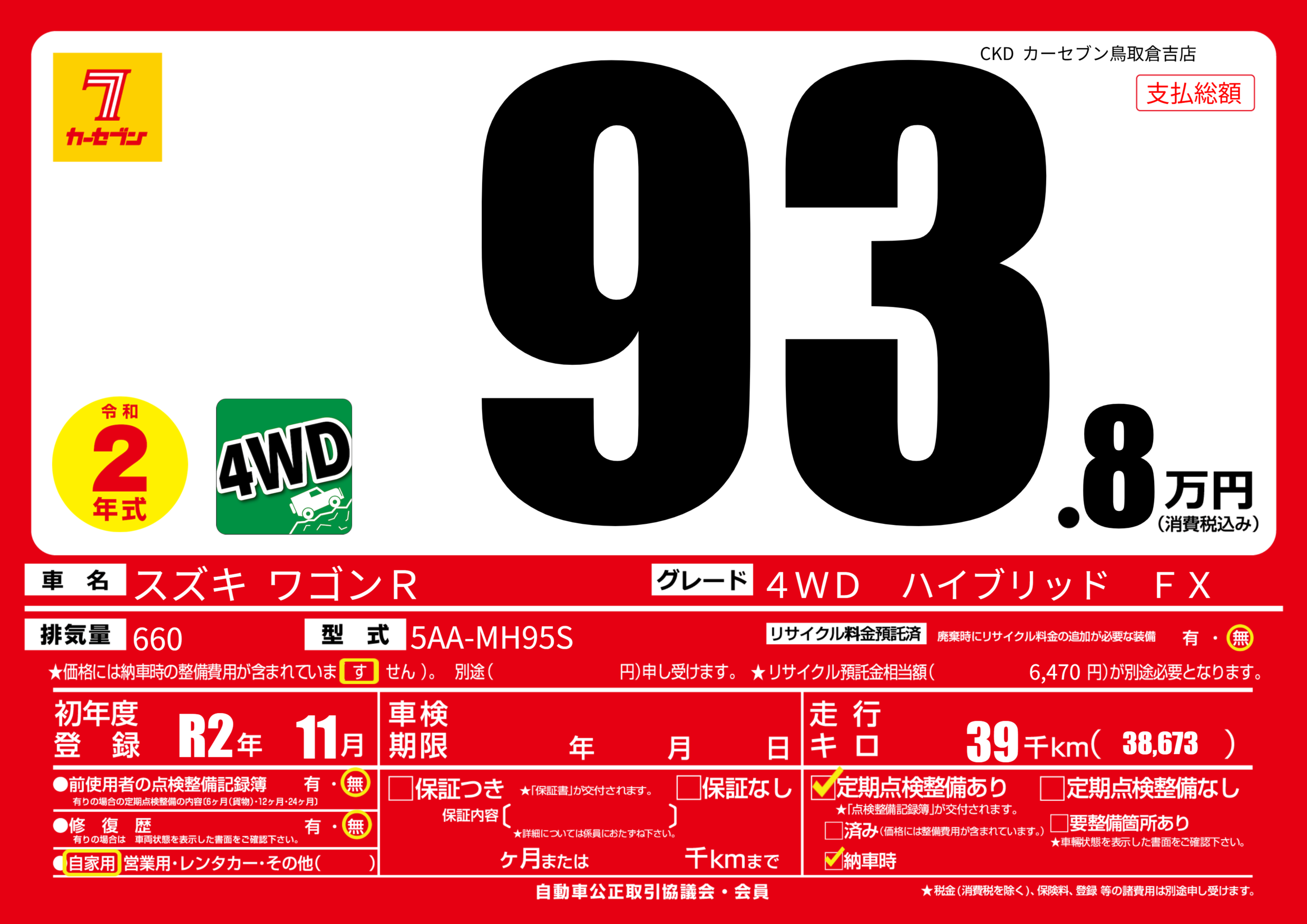 | 定期点検整備 | 定期点検整備あり 納車時あり | ||