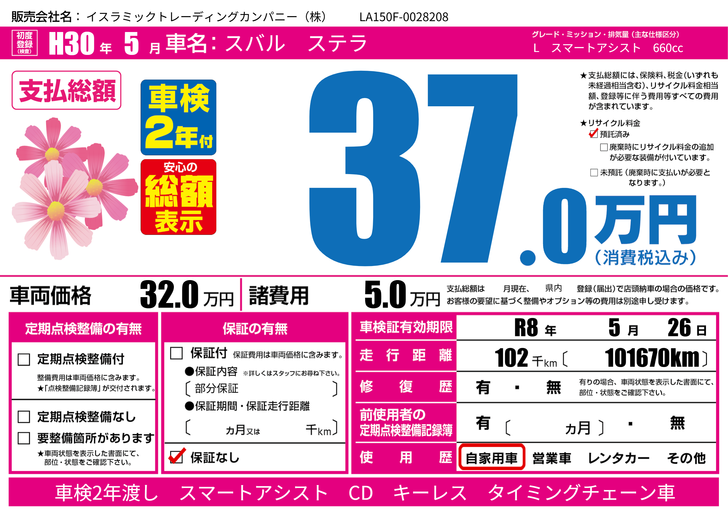 | 走行キロ | 10.2万km | 初年度登録 | H30年5月 |