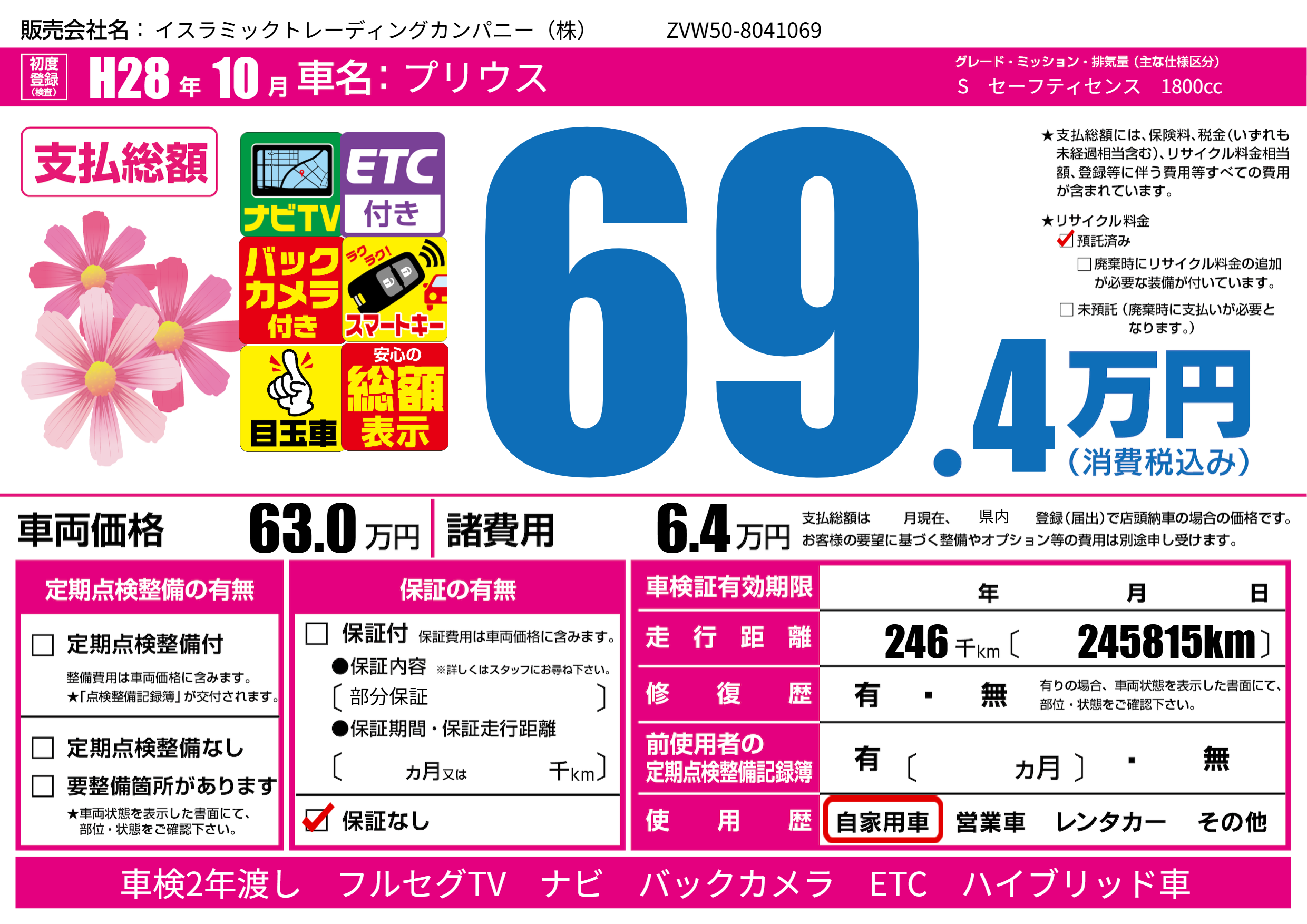 | 走行キロ | 24.6万km | 初年度登録 | H28年10月 |