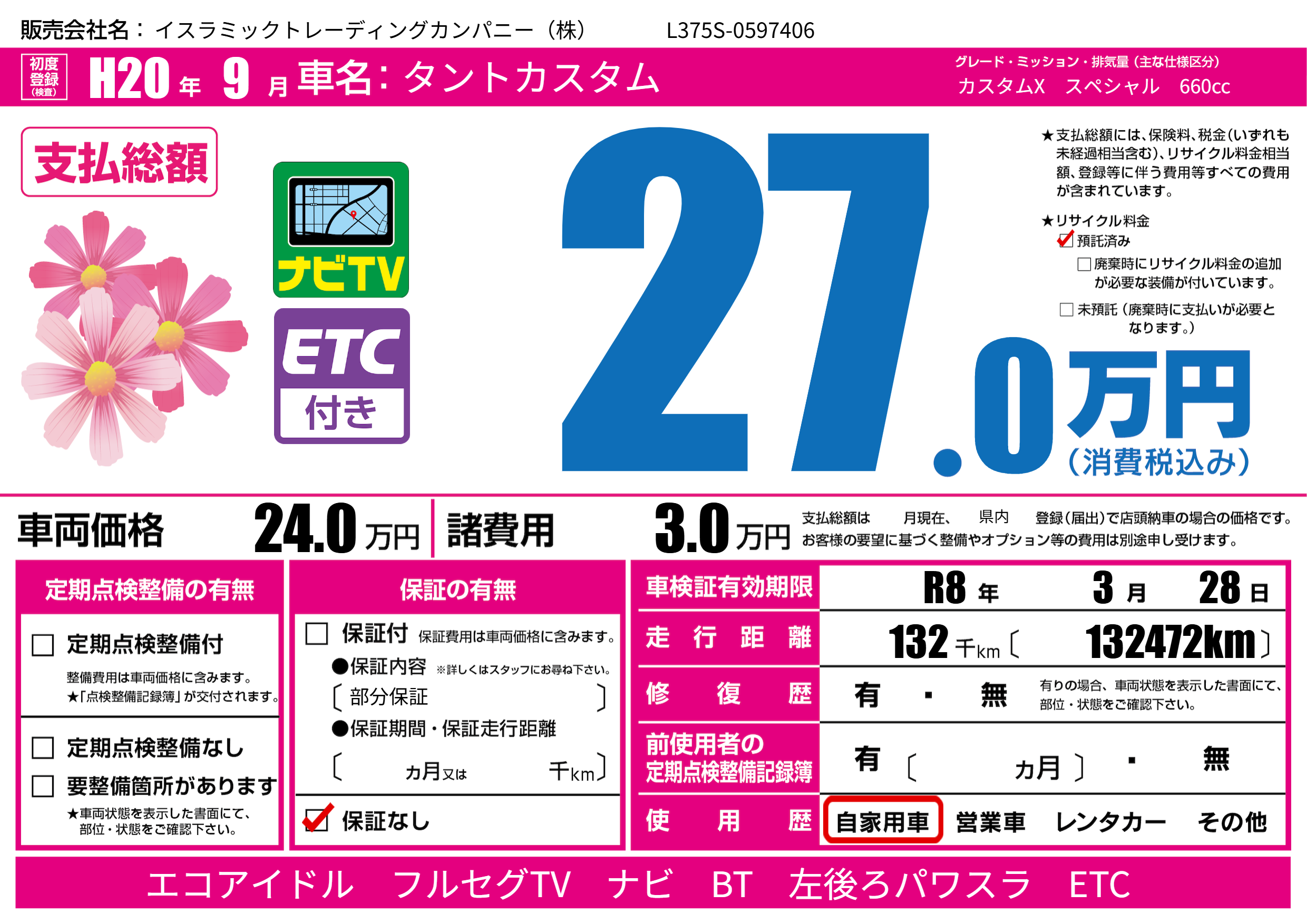 | 車名 | タントカスタム | グレード ミッション 排気量 |