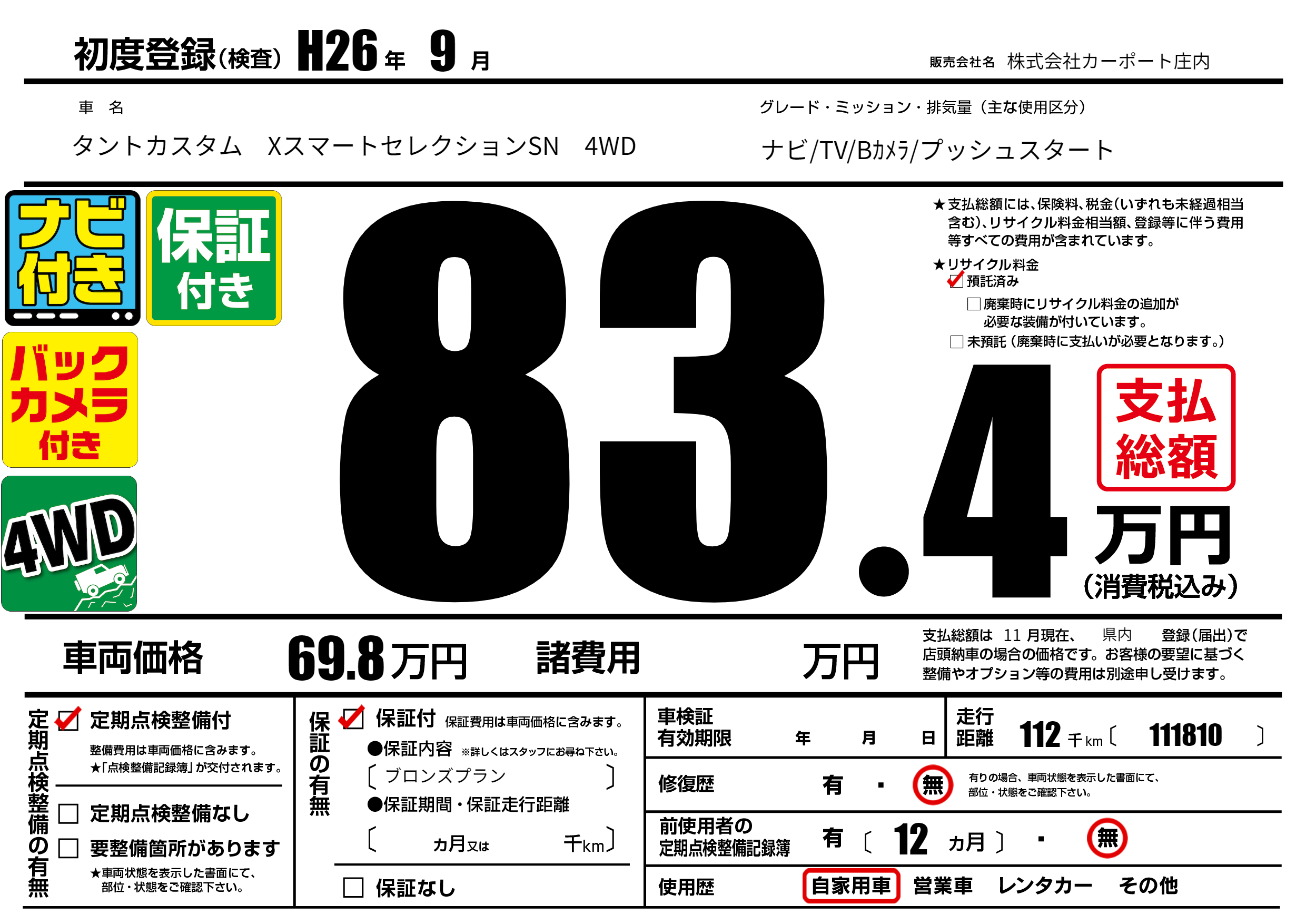| 車名 | タントカスタム XスマートセレクションSN 4WD | グレード ミッション 排気量 |