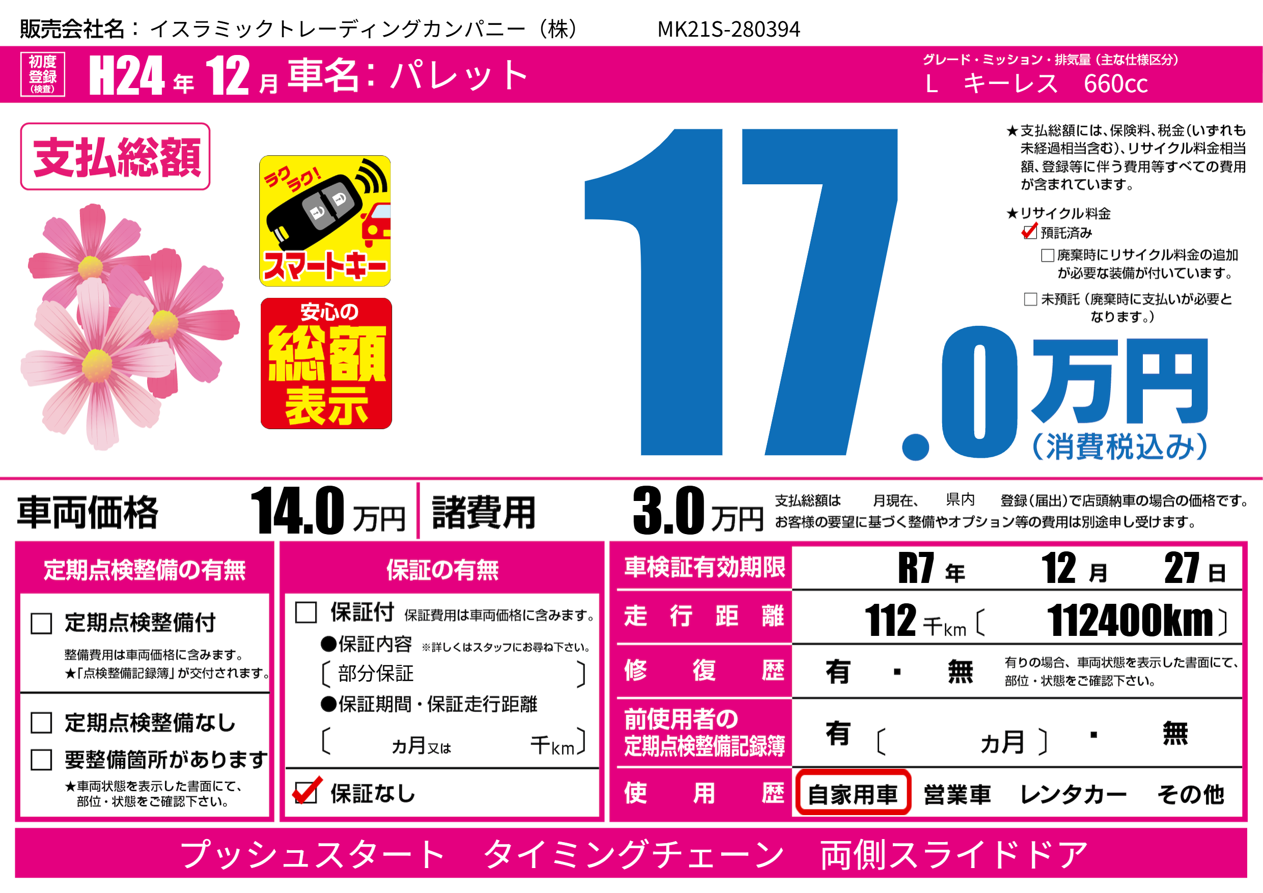 | 走行キロ | 11.2万km | 初年度登録 | H24年12月 |