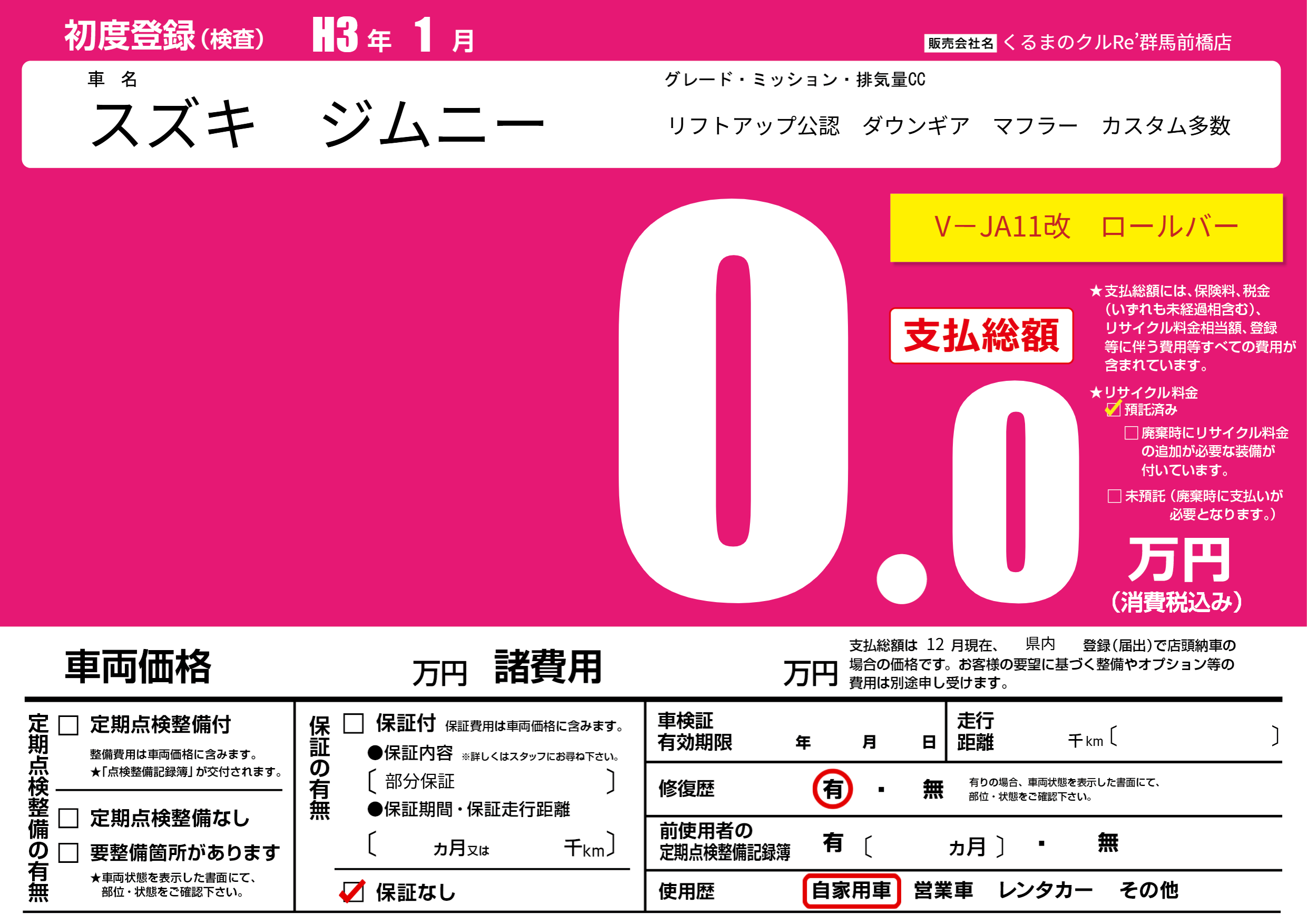 | 走行キロ | - | 初年度登録 | H3年1月 |