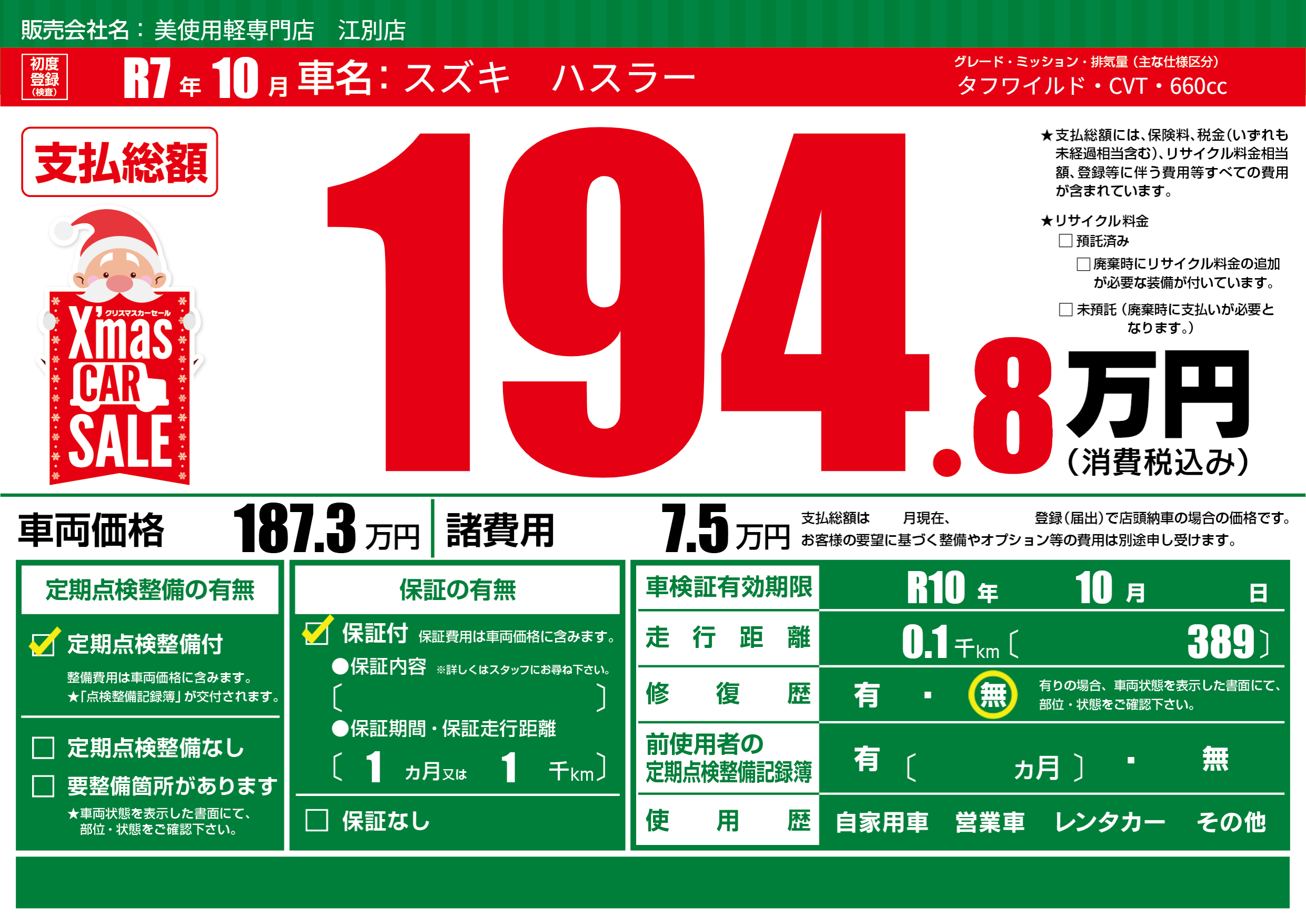 | 走行キロ | - | 初年度登録 | R7年10月 |