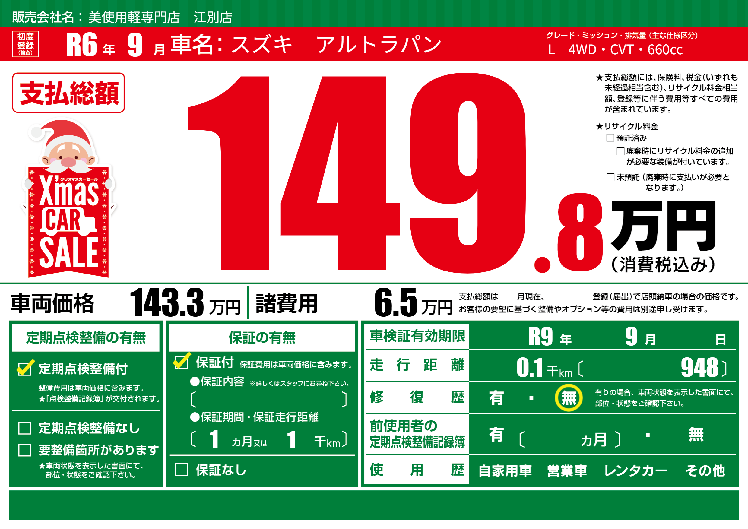 | 走行キロ | - | 初年度登録 | R6年9月 |