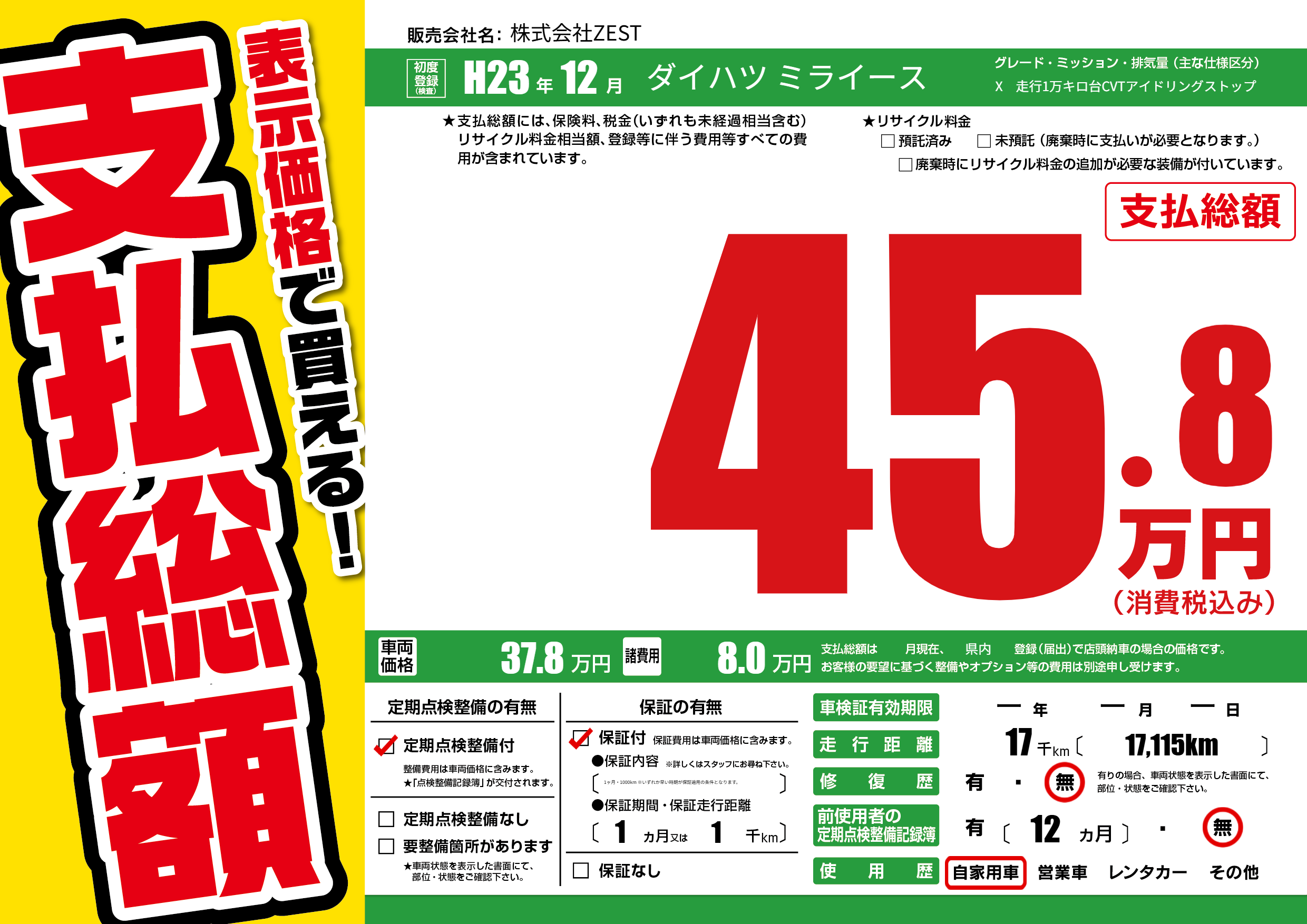 | 走行キロ | 1.7万km | 初年度登録 | H23年12月 |