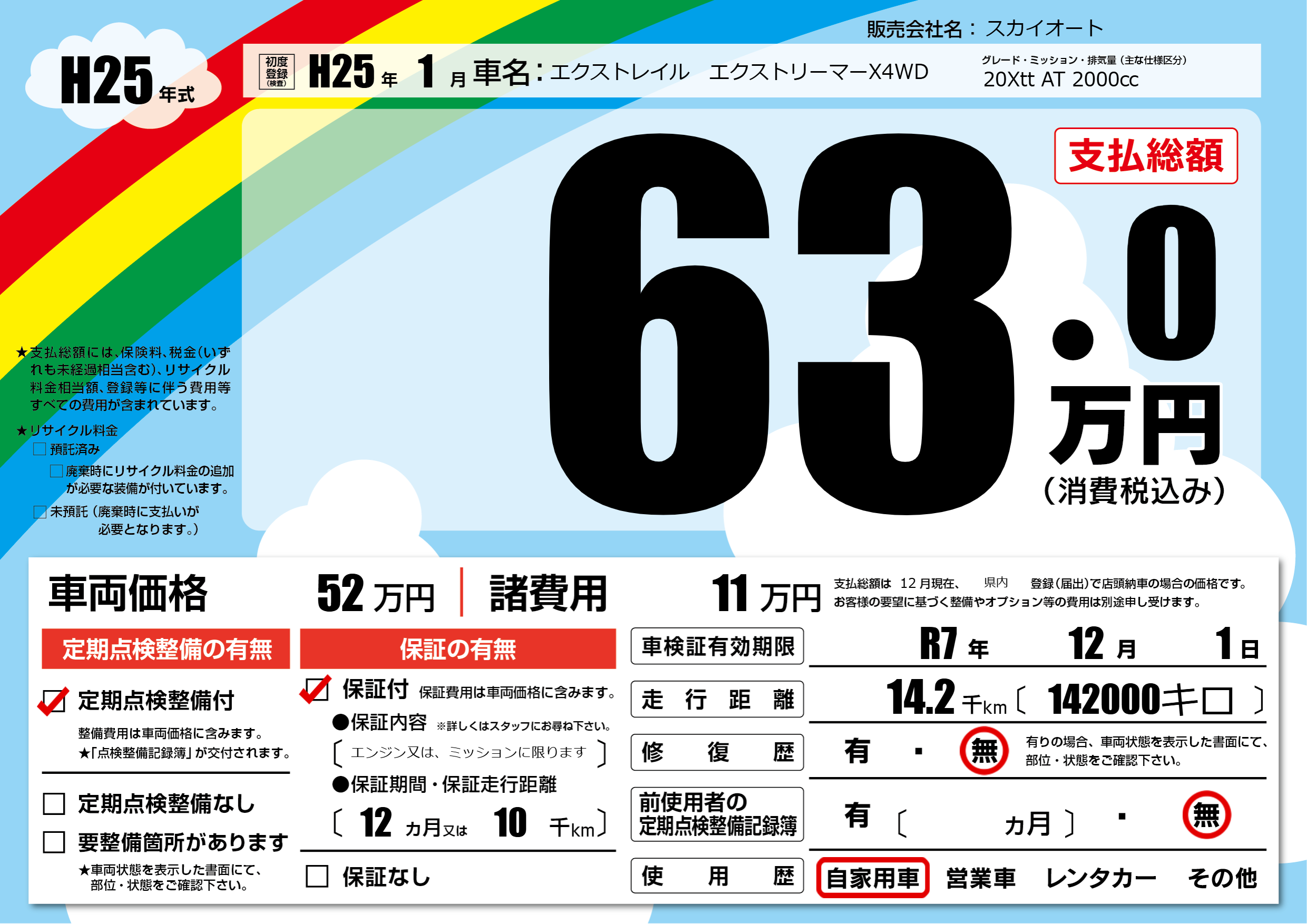 | 車名 | エクストレイル エクストリーマーX4WD | グレード ミッション 排気量 |