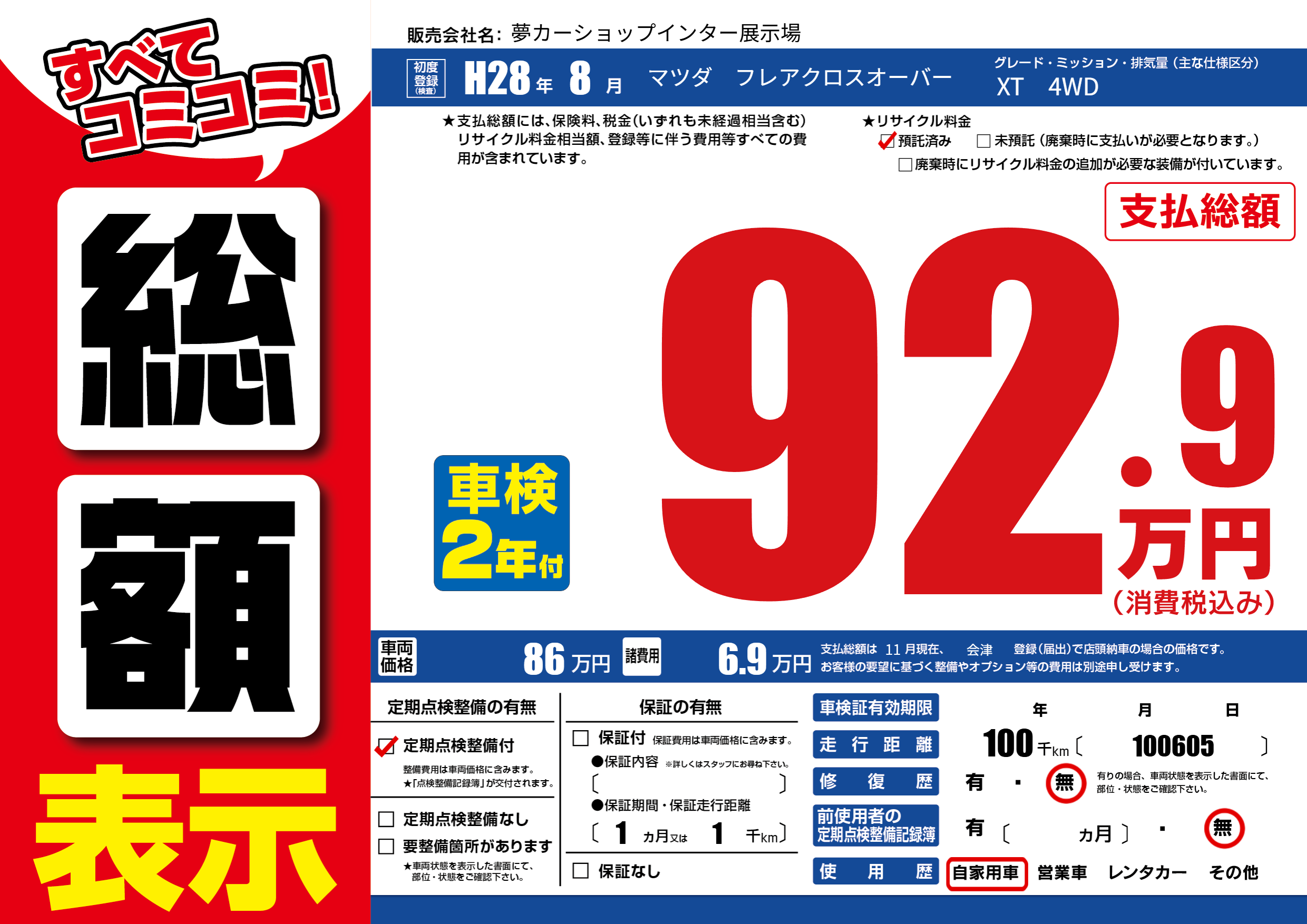 | 走行キロ | 10万km | 初年度登録 | H28年8月 |