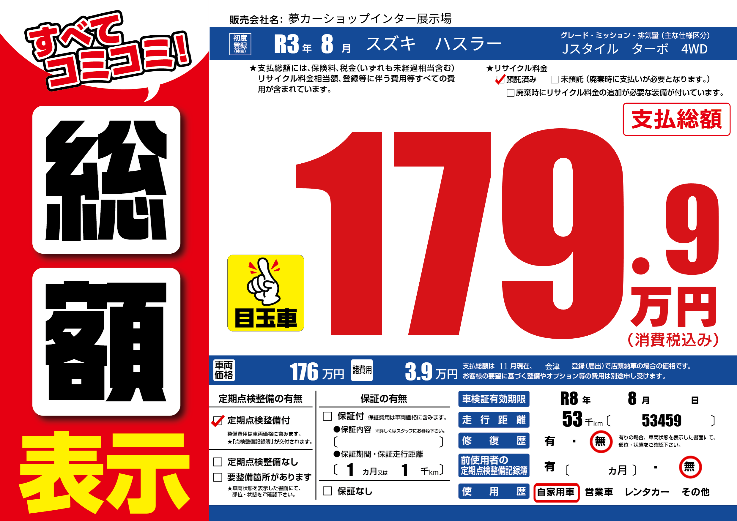 | 車名 | スズキ ハスラー | グレード ミッション 排気量 |