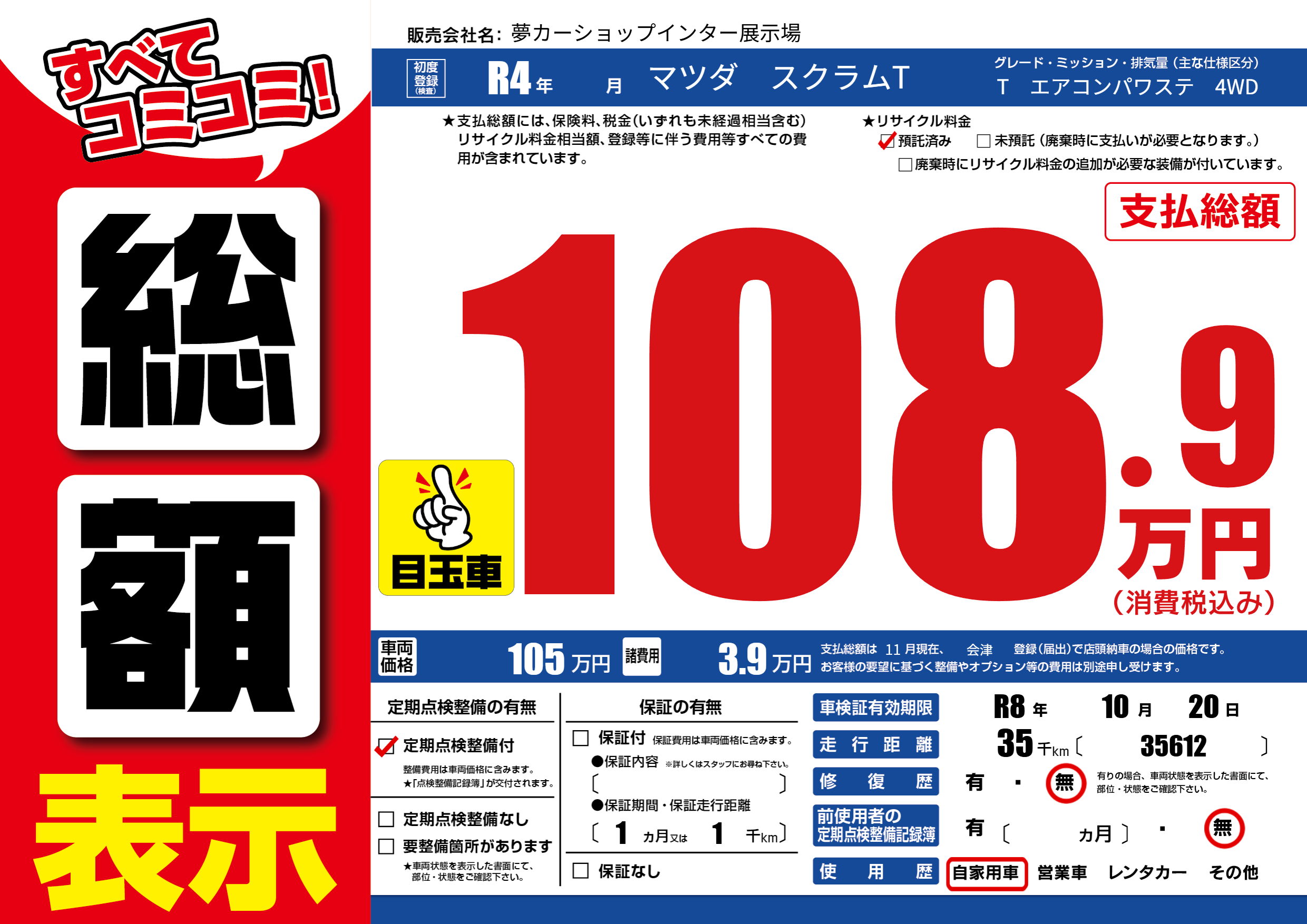 | 車名 | マツダ スクラムT | グレード ミッション 排気量 |