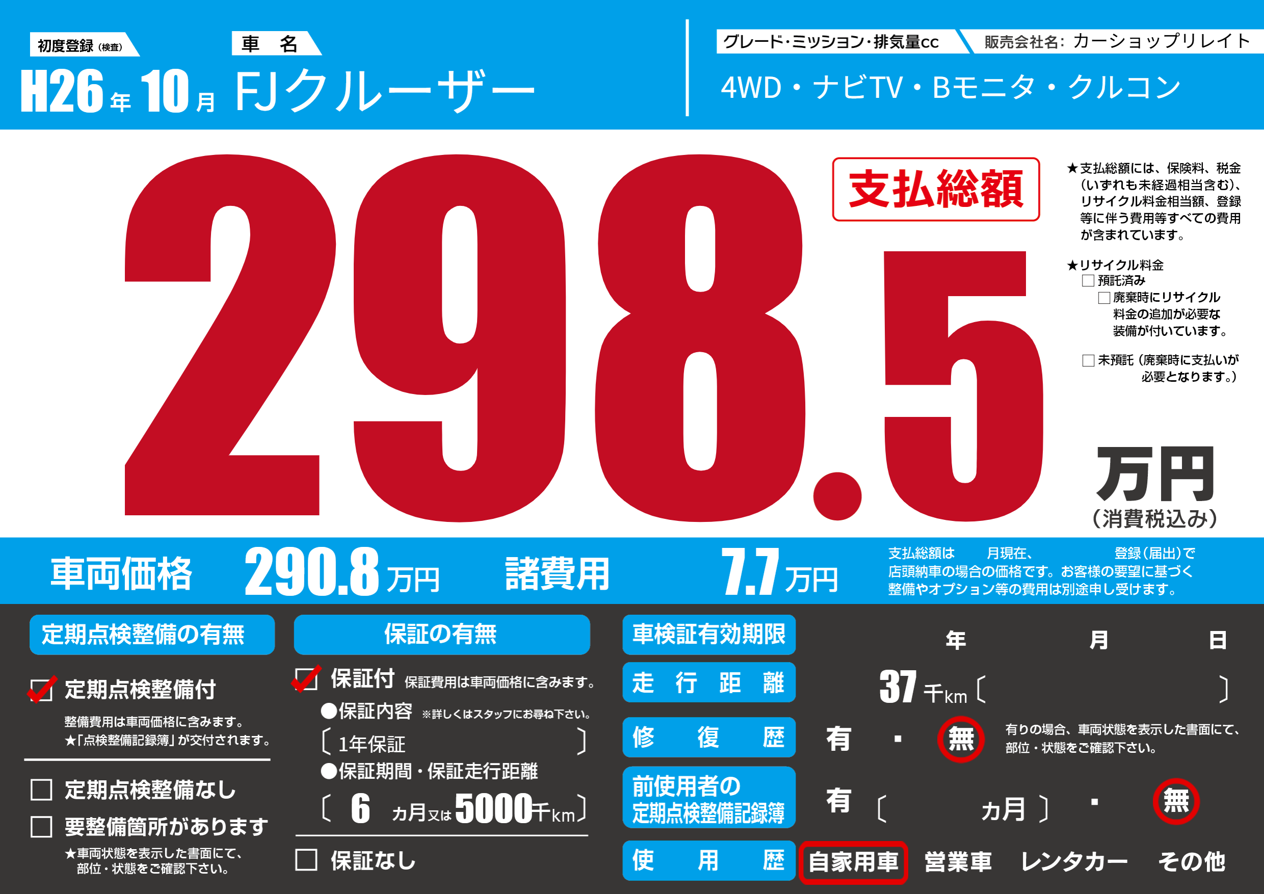 | 走行キロ | 3.7万km | 初年度登録 | H26年10月 |