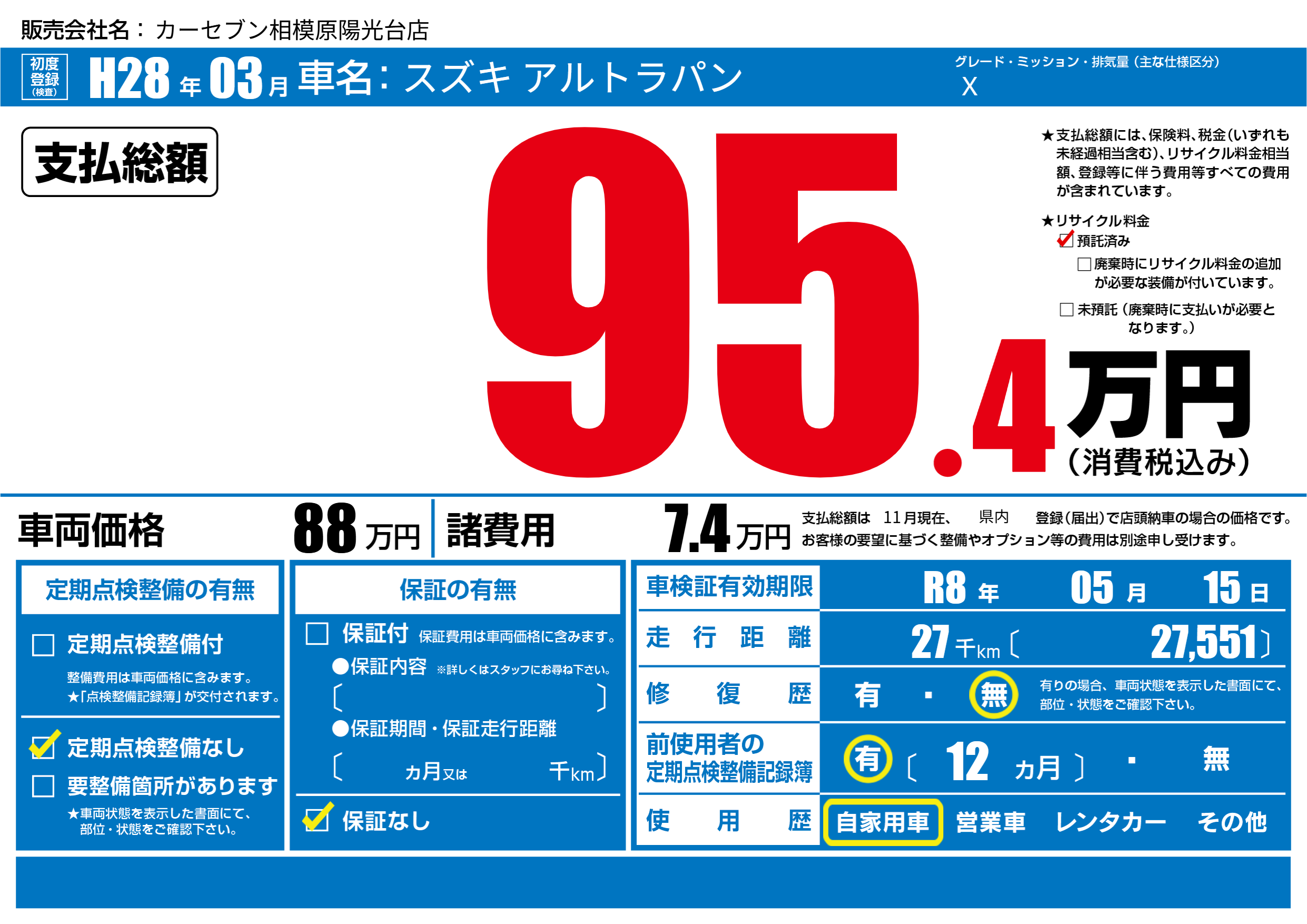 | 走行キロ | 2.7万km | 初年度登録 | H28年03月 |