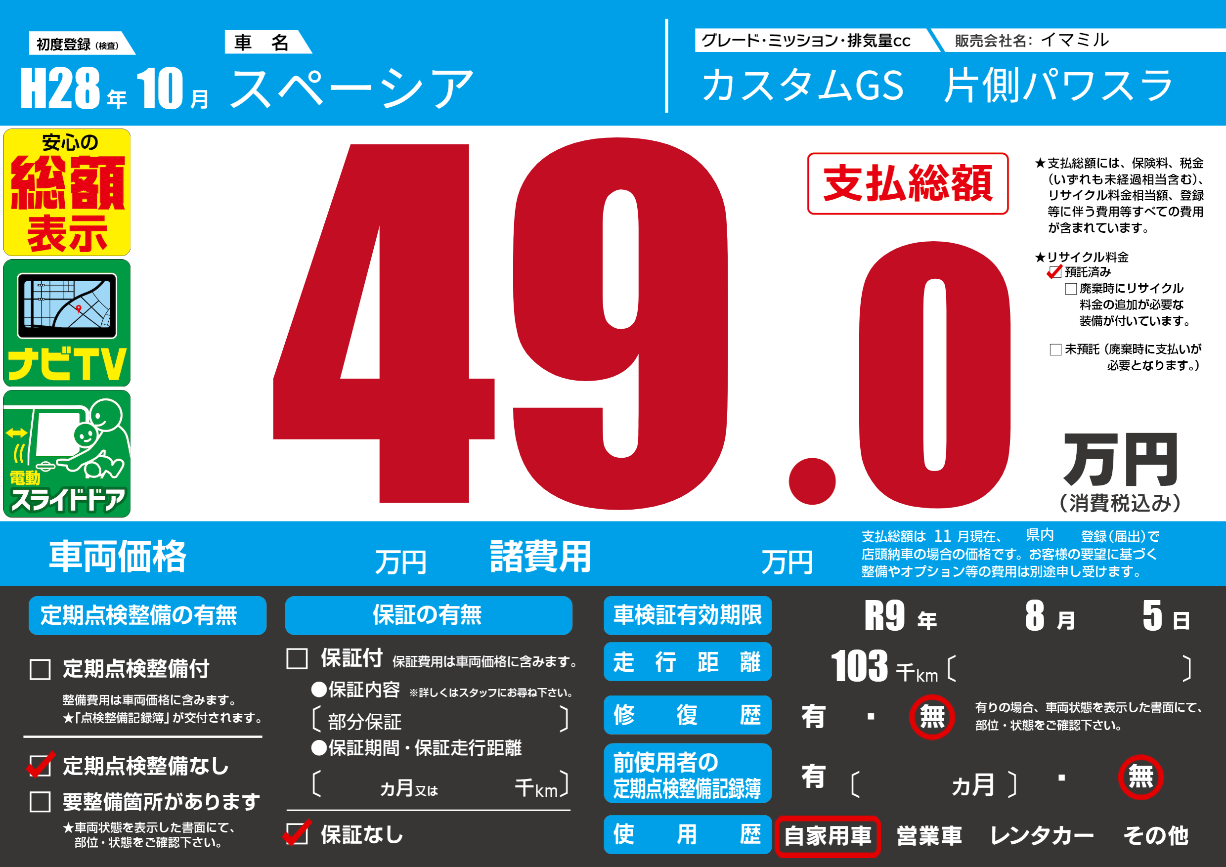 | 走行キロ | 10.3万km | 初年度登録 | H28年10月 |