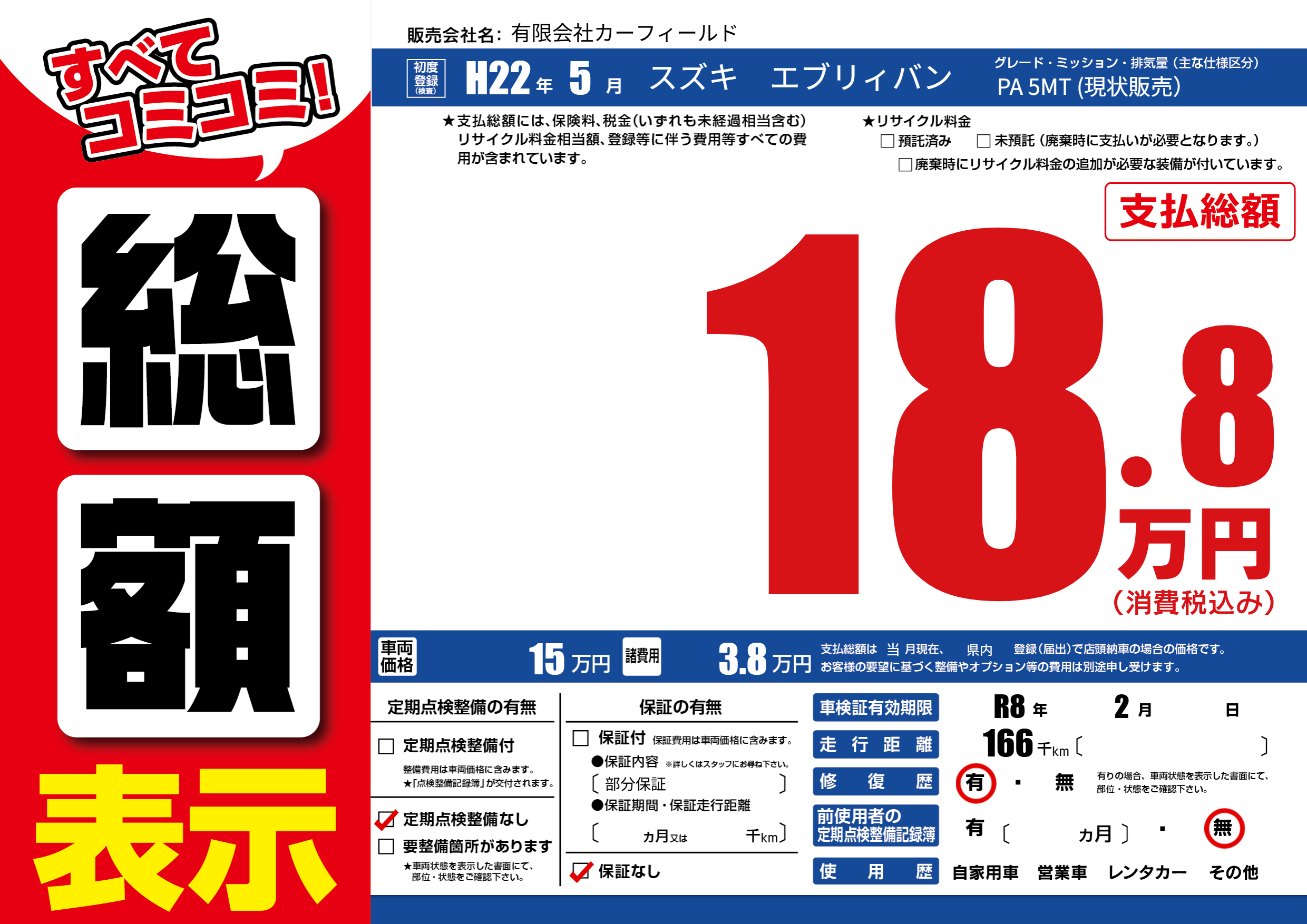 | 車名 | スズキ エブリィバン | グレード ミッション 排気量 |