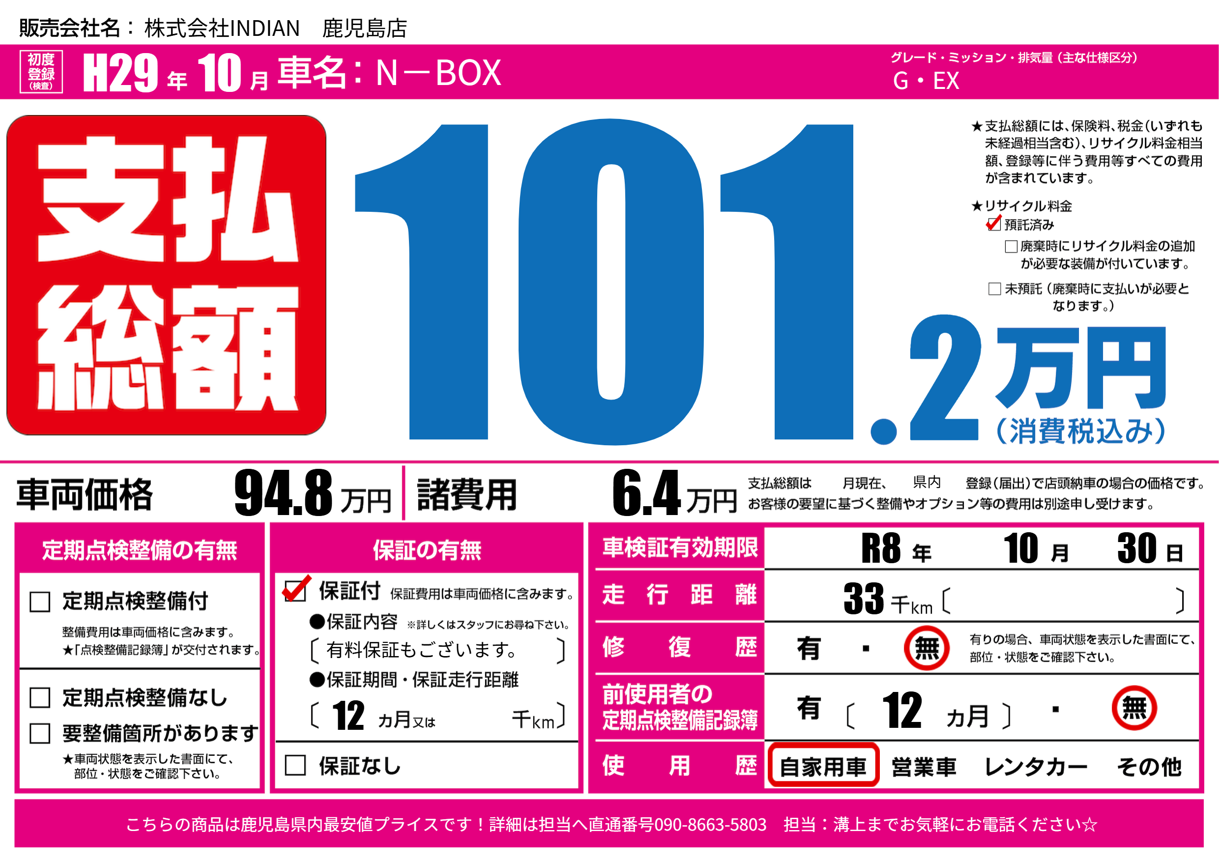 | 車名 | N-BOX | グレード ミッション 排気量 |