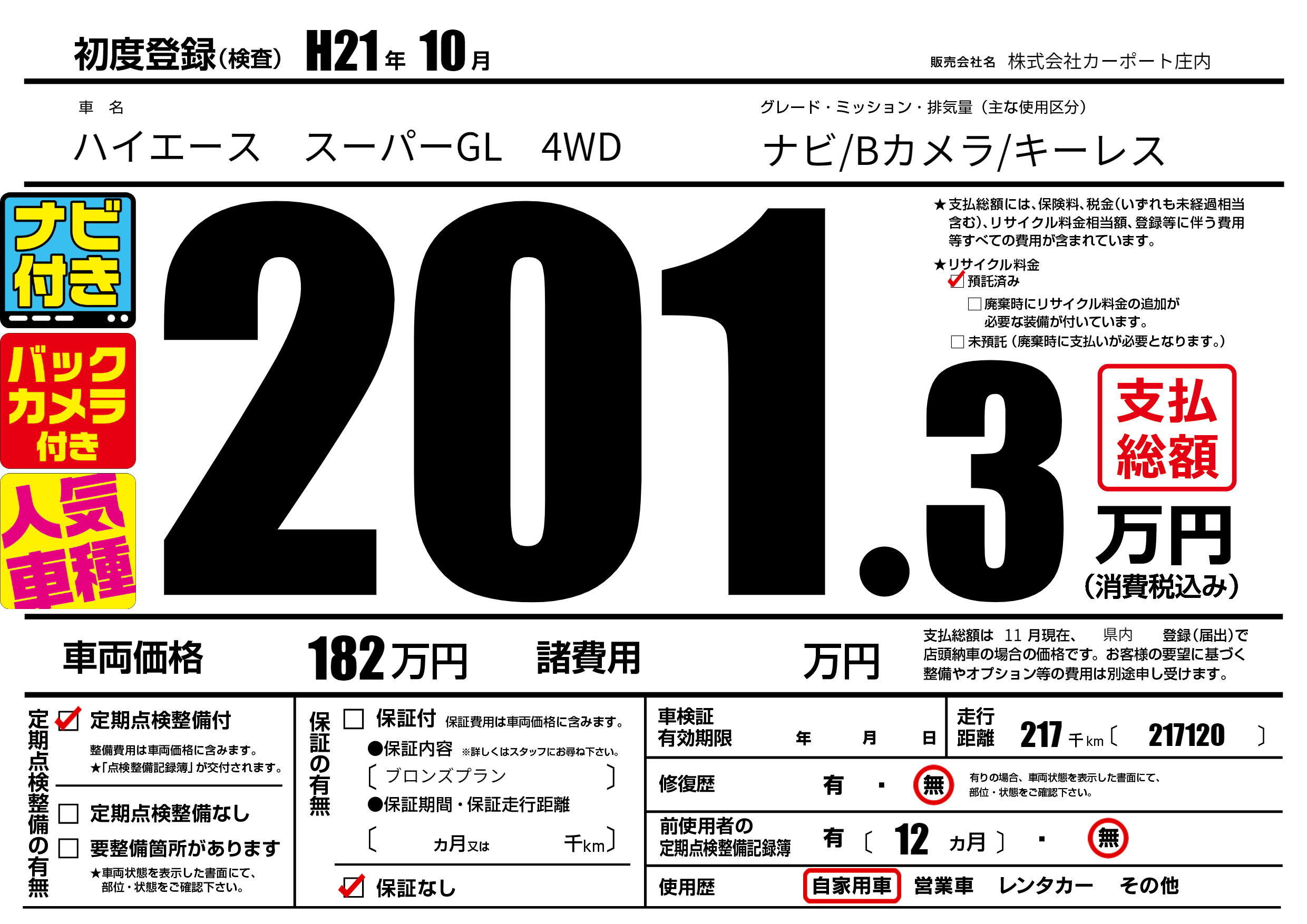 | 走行キロ | 21.7万km | 初年度登録 | H21年10月 |