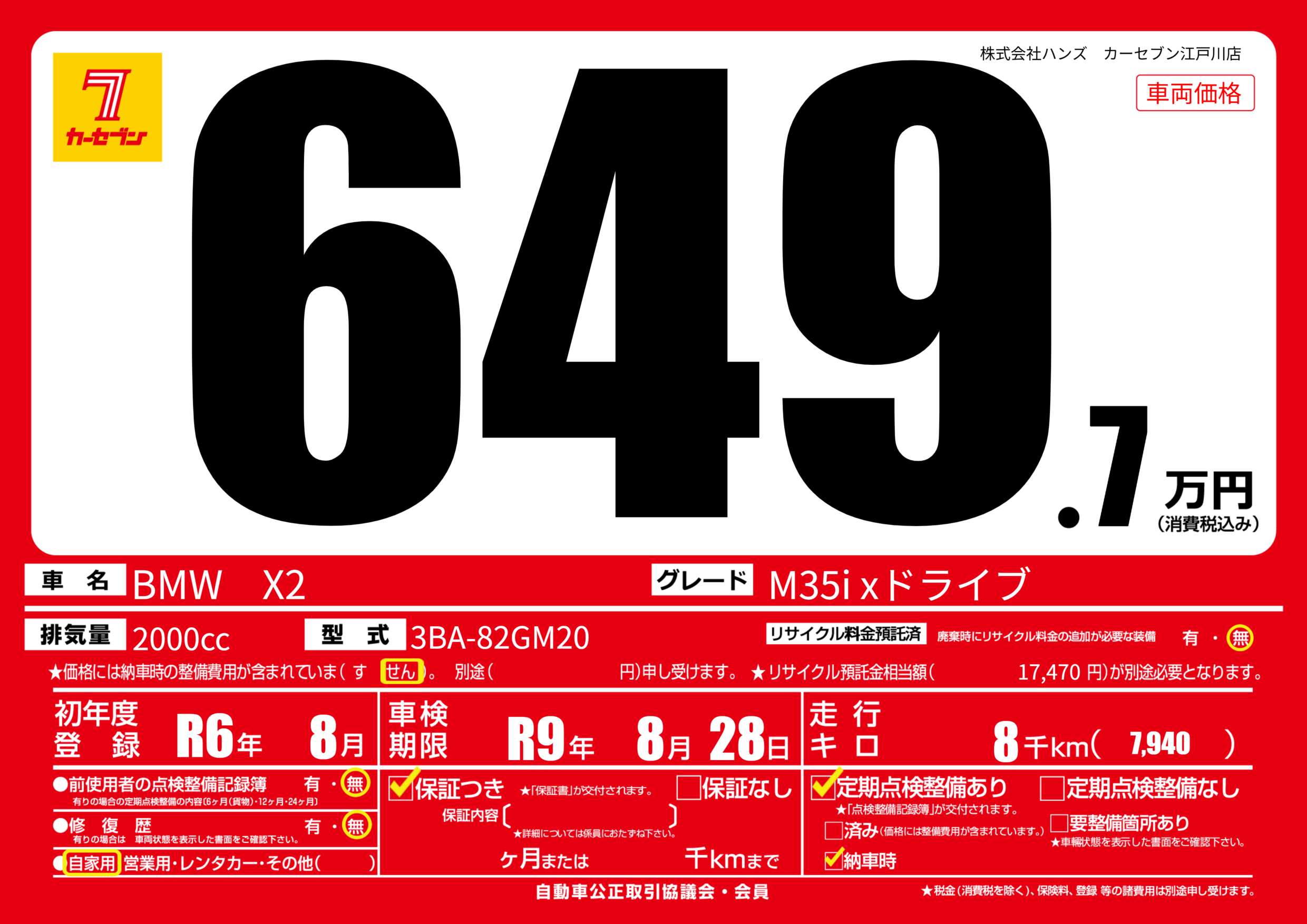| 走行キロ | 0.8万km | 初年度登録 | R6年8月 |