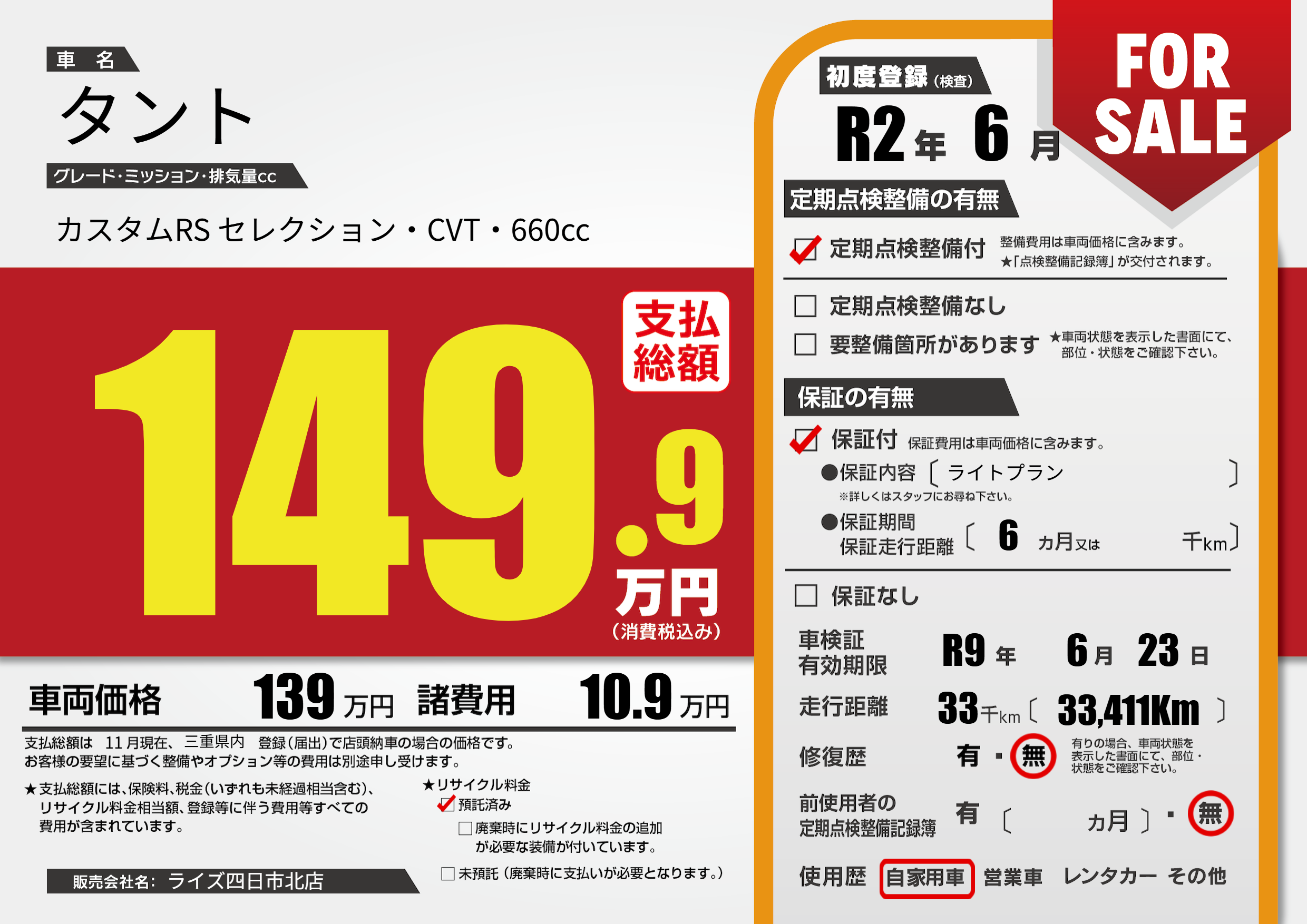 | 走行キロ | 3.3万km | 初年度登録 | R2年6月 |