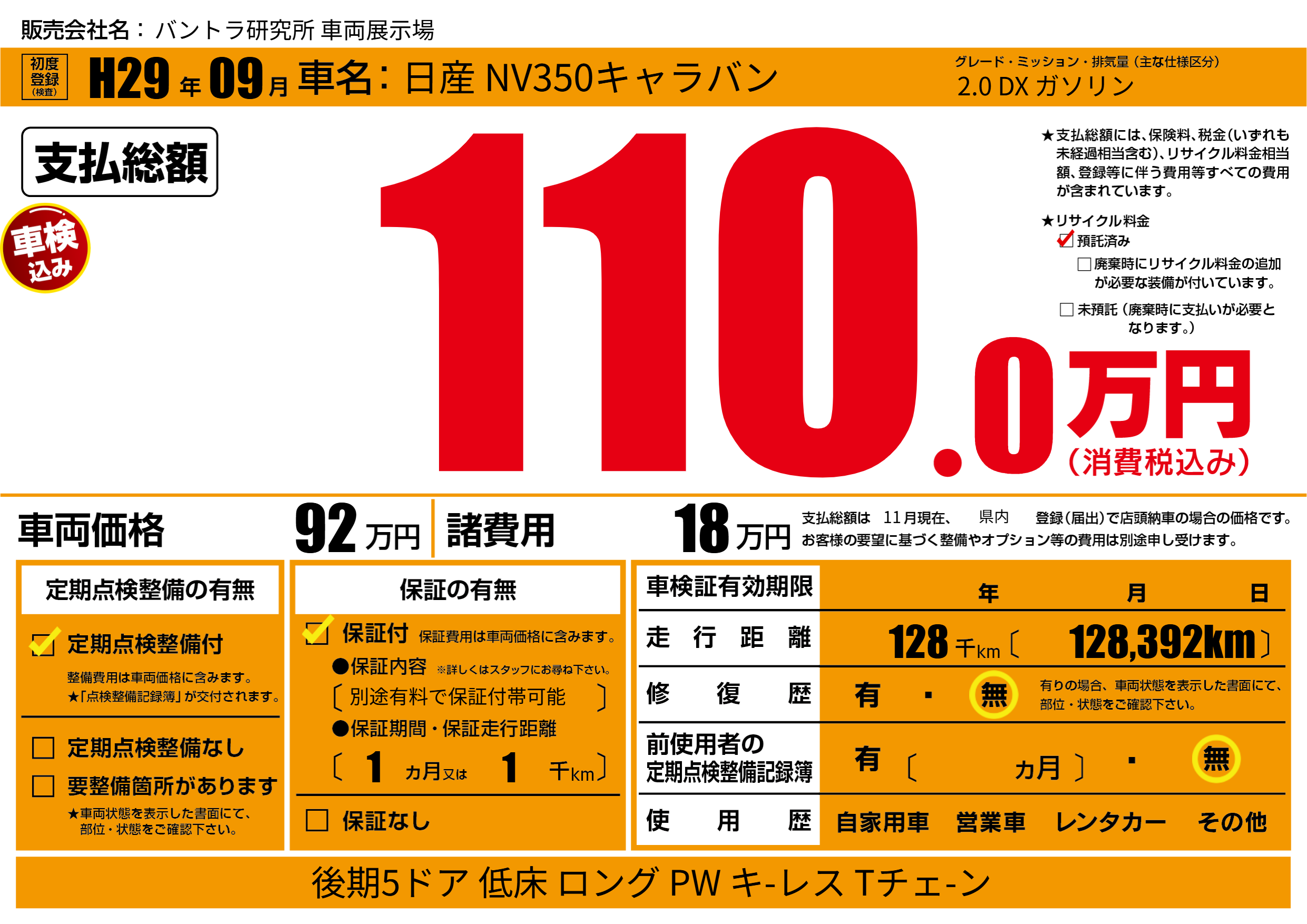 | 車名 | 日産 NV350キャラバン | グレード ミッション 排気量 |