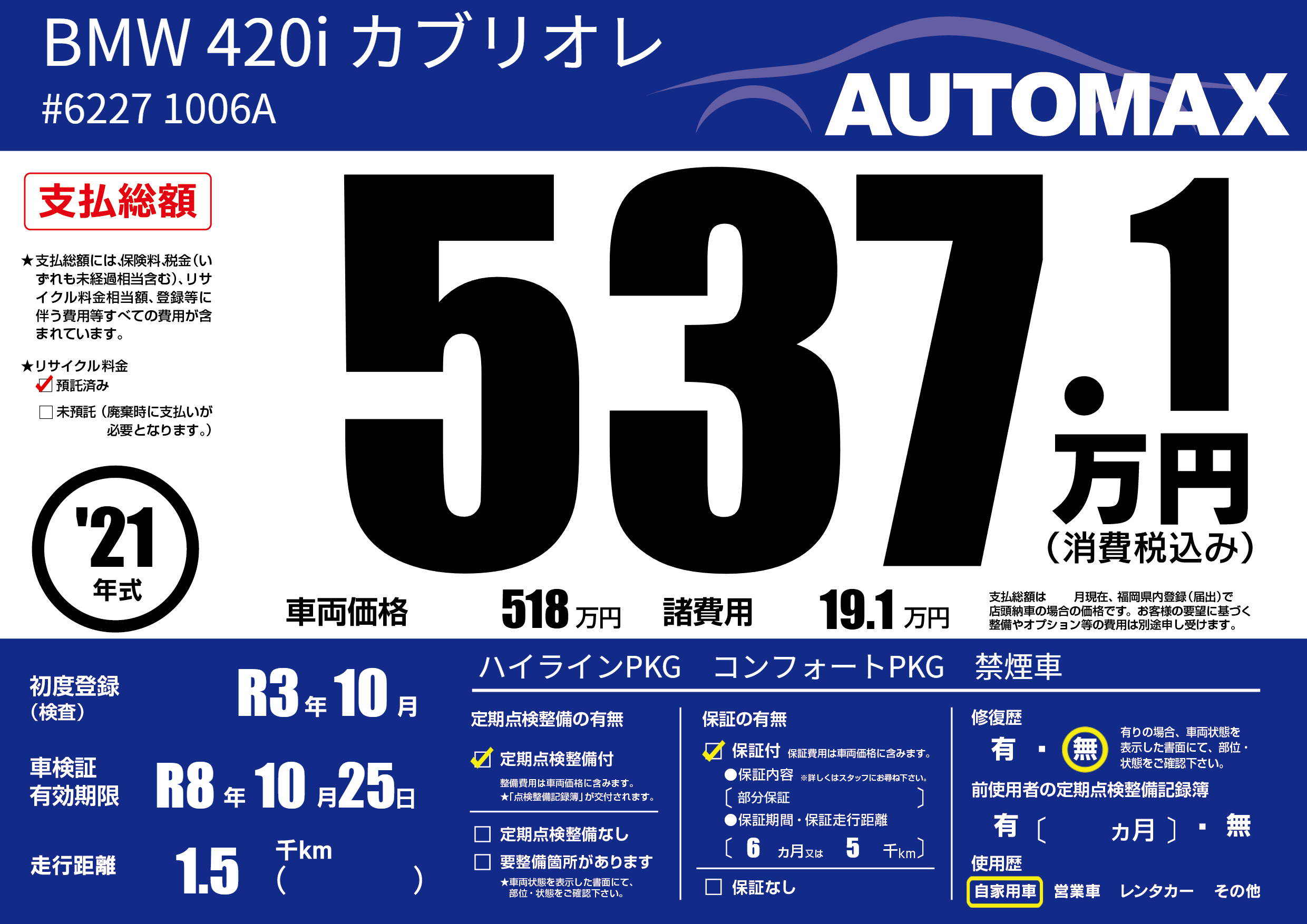 | 車名 | BMW 420i カブリオレ | グレード ミッション 排気量 |