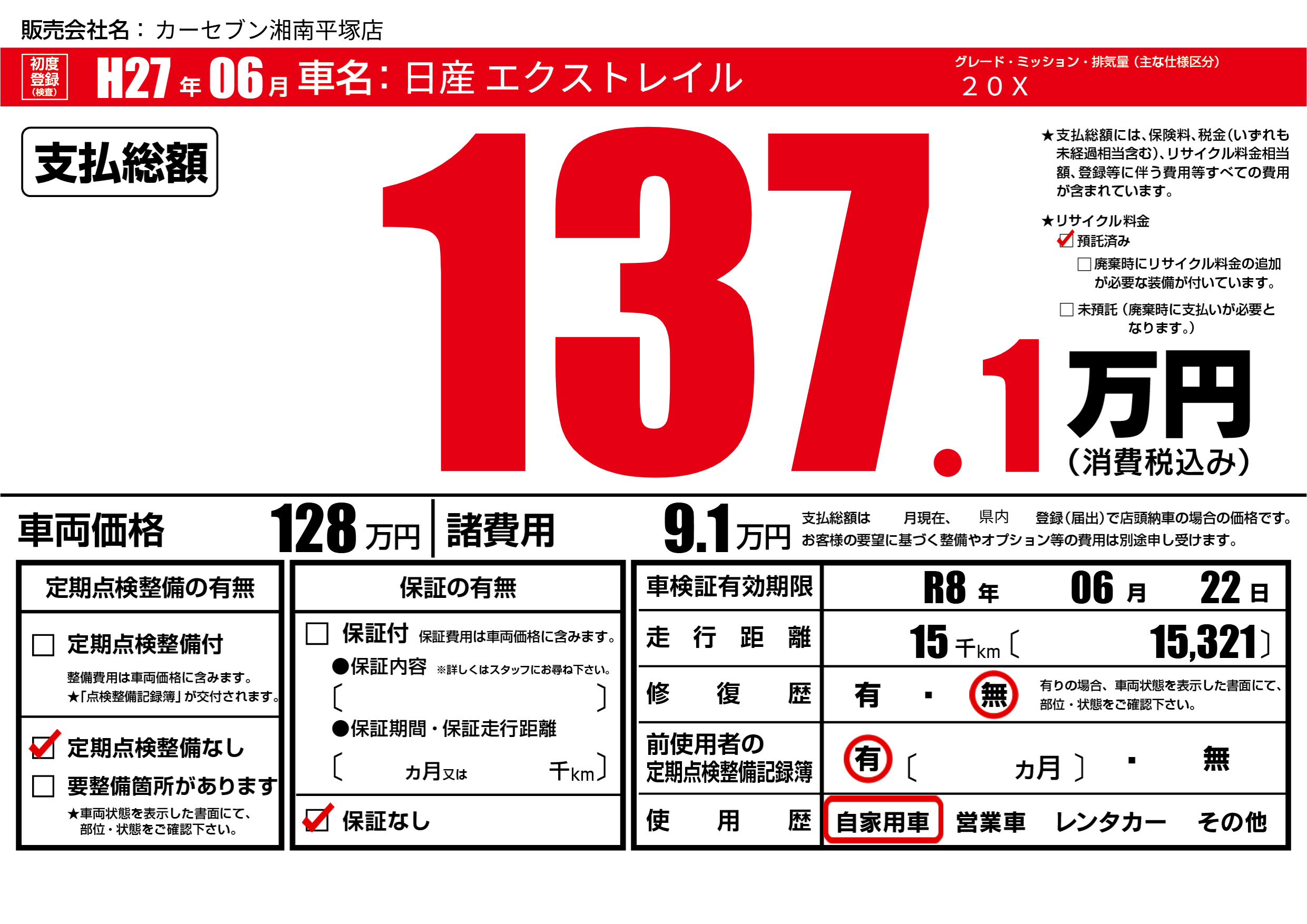 | 走行キロ | 1.5万km | 初年度登録 | H27年06月 |