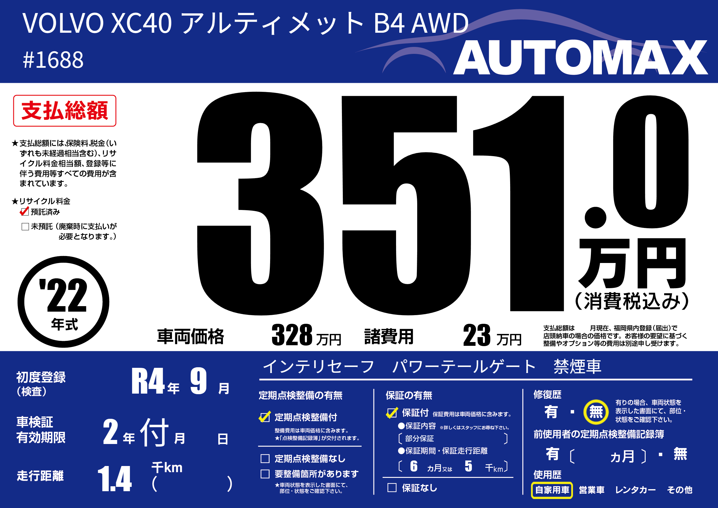 | 車名 | VOLVO XC40 アルティメット B4 AWD | グレード ミッション 排気量 |