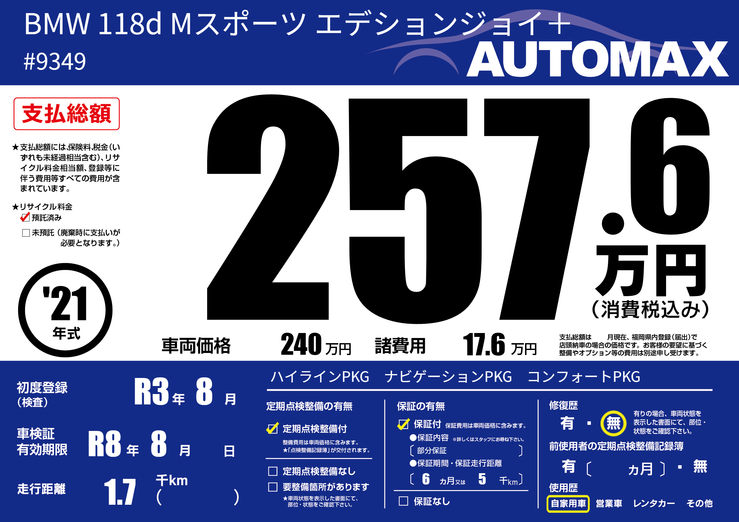 | 車名 | BMW 118d Mスポーツ エデションジョイ+ | グレード ミッション 排気量 |