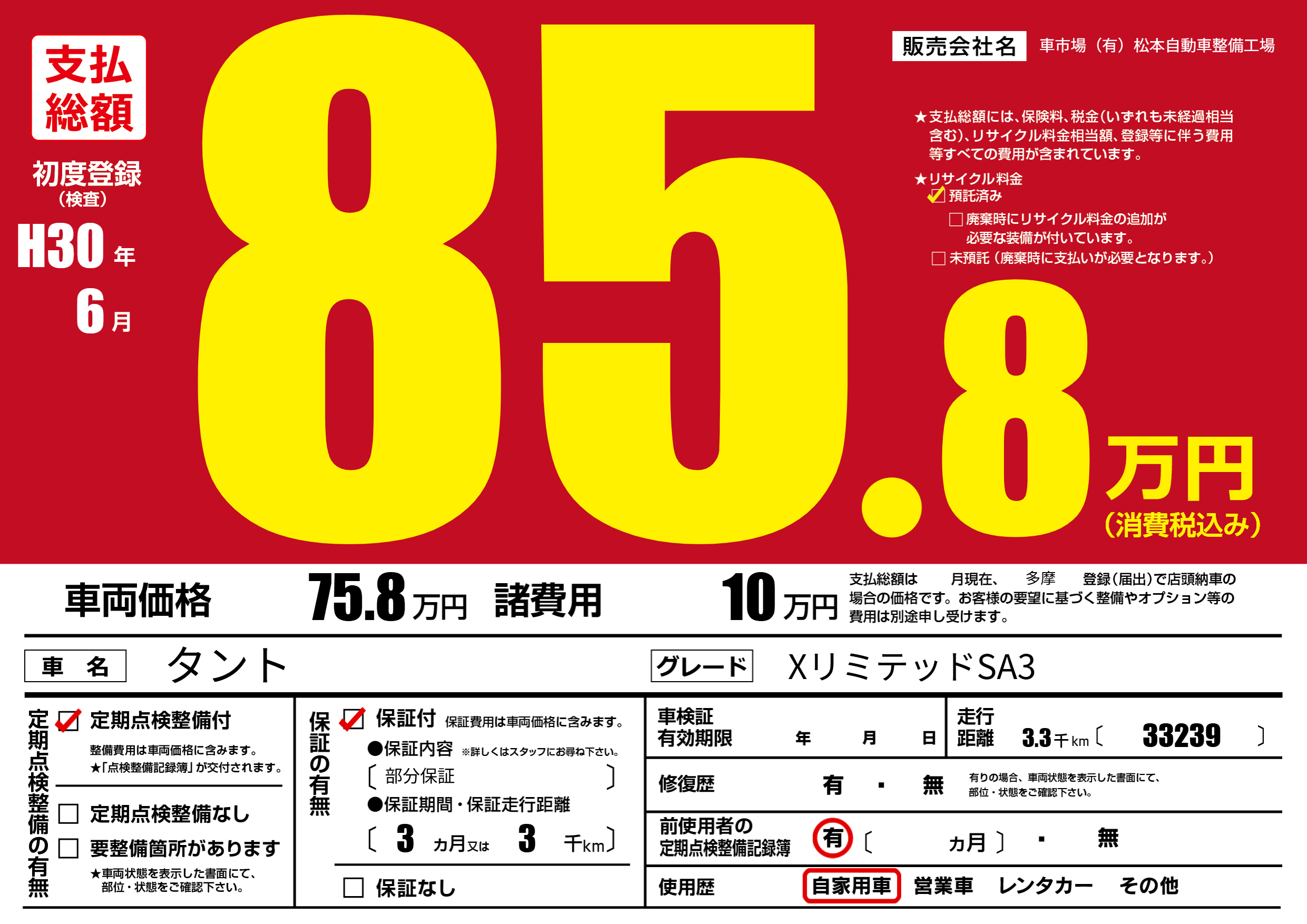 | 走行キロ | 0.3万km | 初年度登録 | H30年6月 |