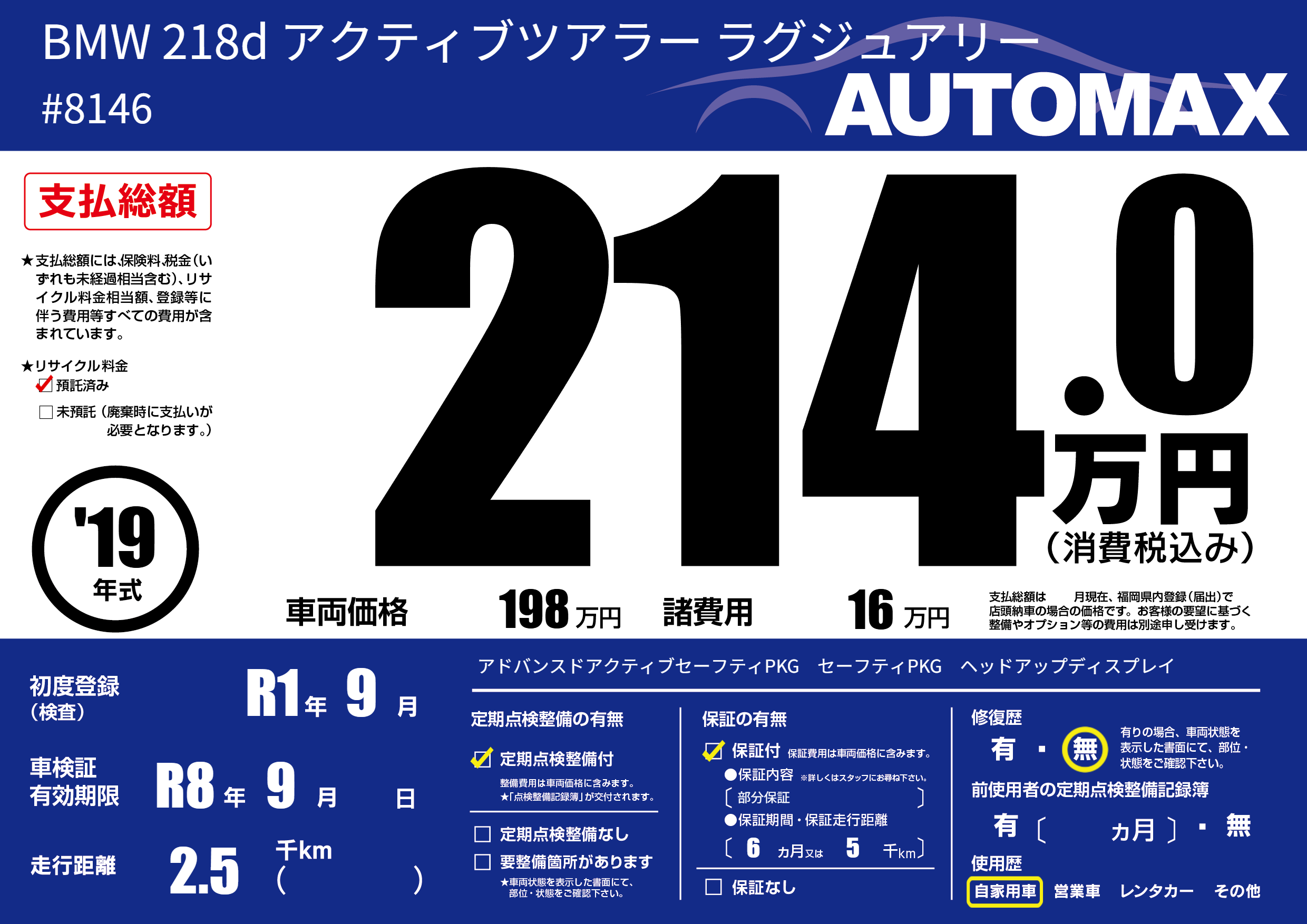 | 車名 | BMW 218d アクティブツアラー ラグジュアリー | グレード ミッション 排気量 |