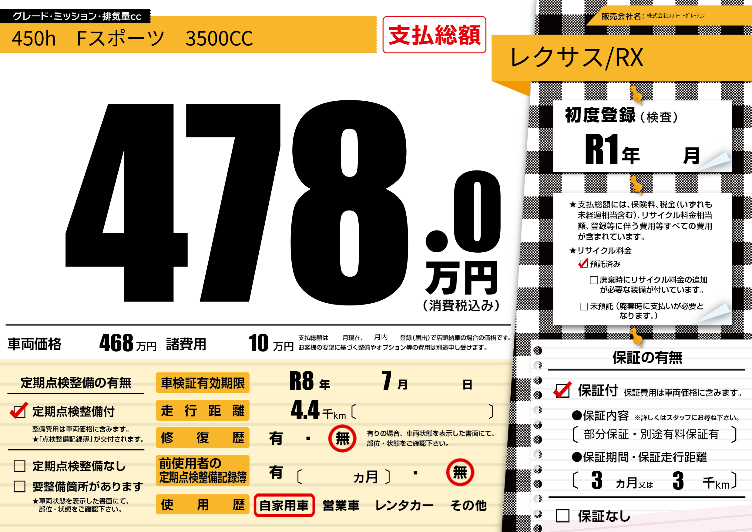 | 車名 | レクサス/RX | グレード ミッション 排気量 |