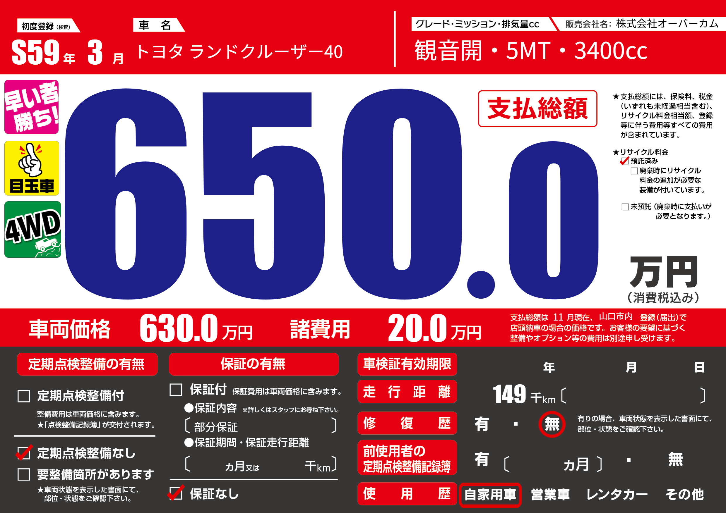 保証なし 保証内容(部分保証) ---ヶ月または()千kmまで |
