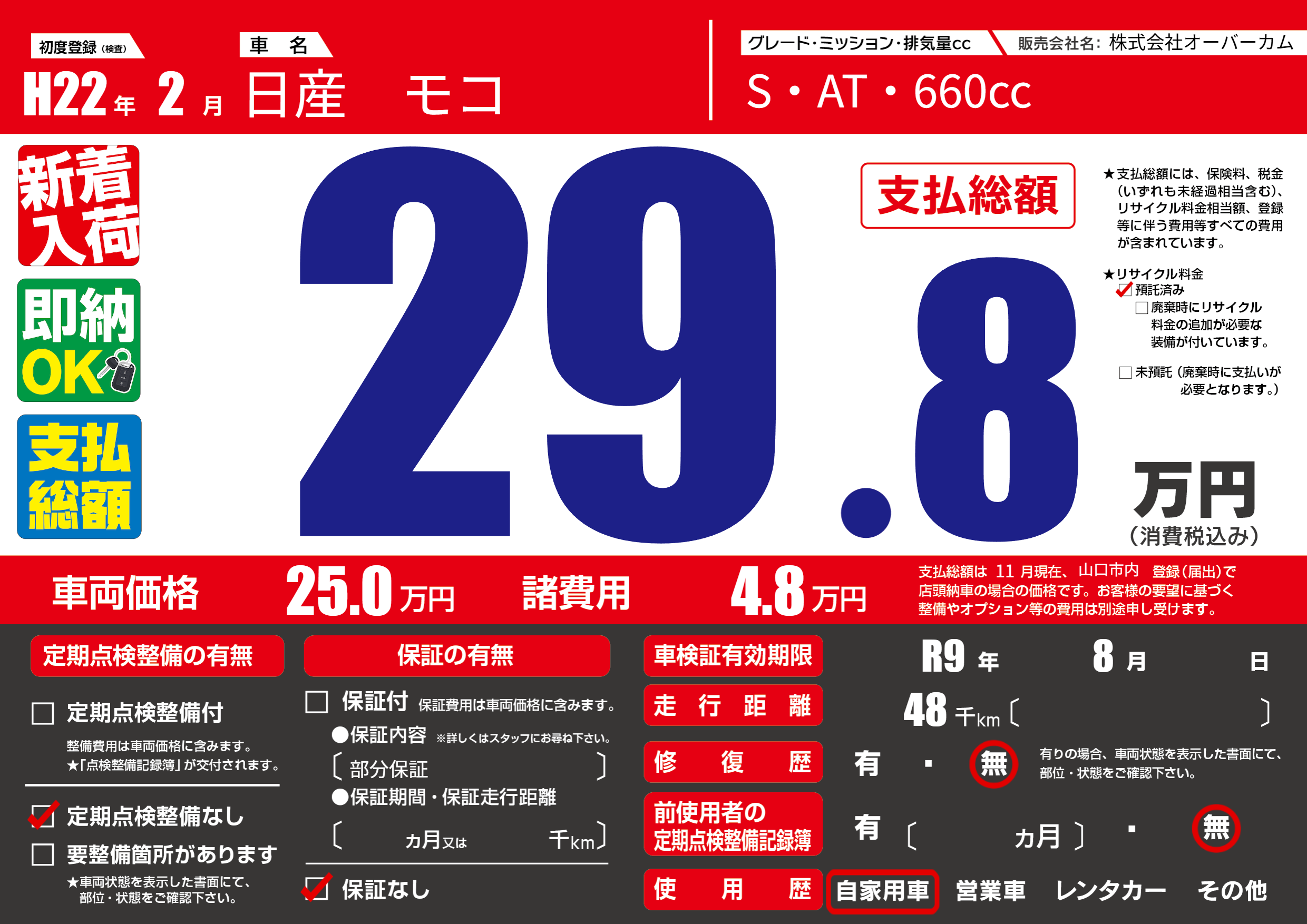 | 走行キロ | 4.8万km | 初年度登録 | H22年2月 |