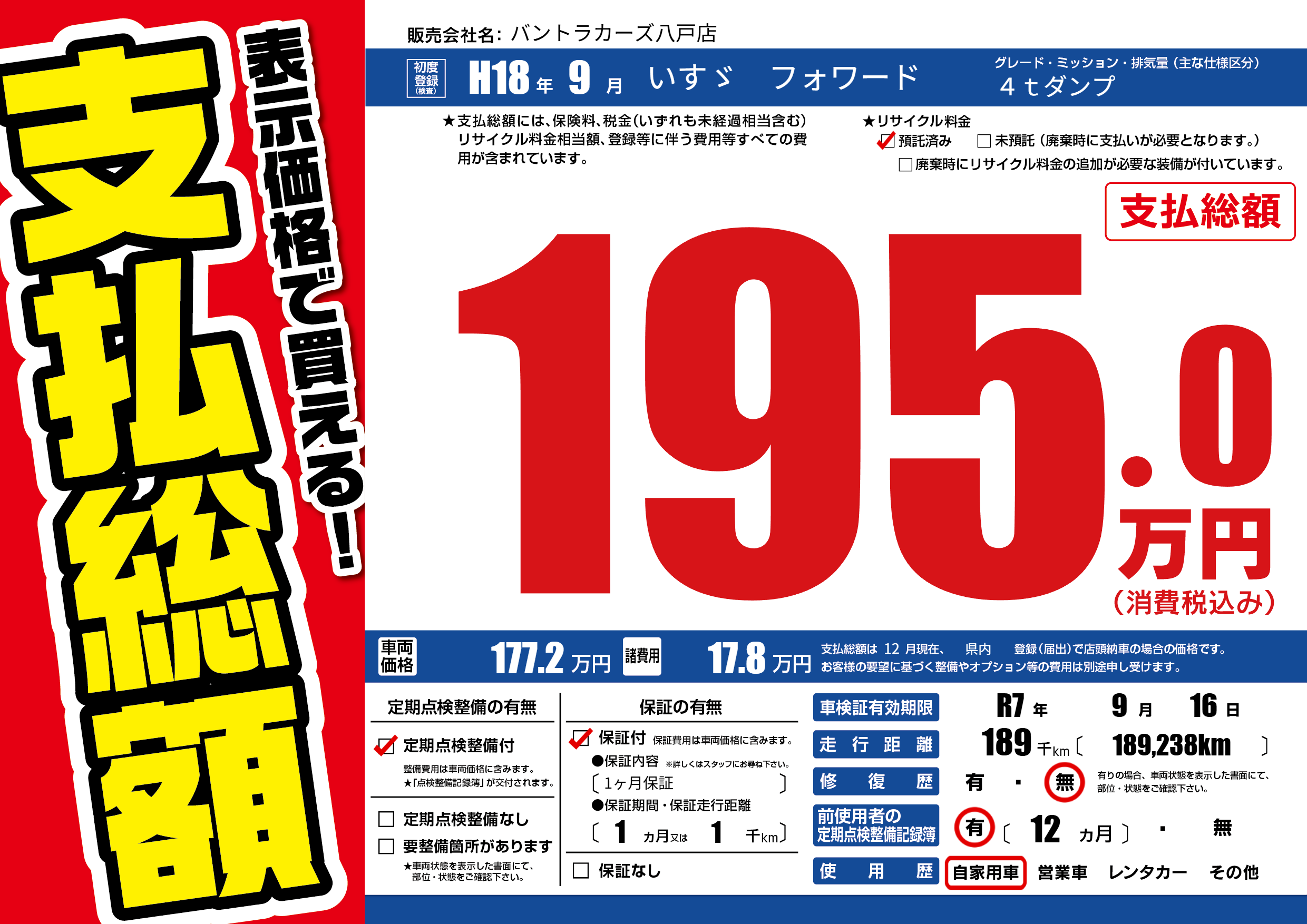 | 走行キロ | 18.9万km | 初年度登録 | H18年9月 |